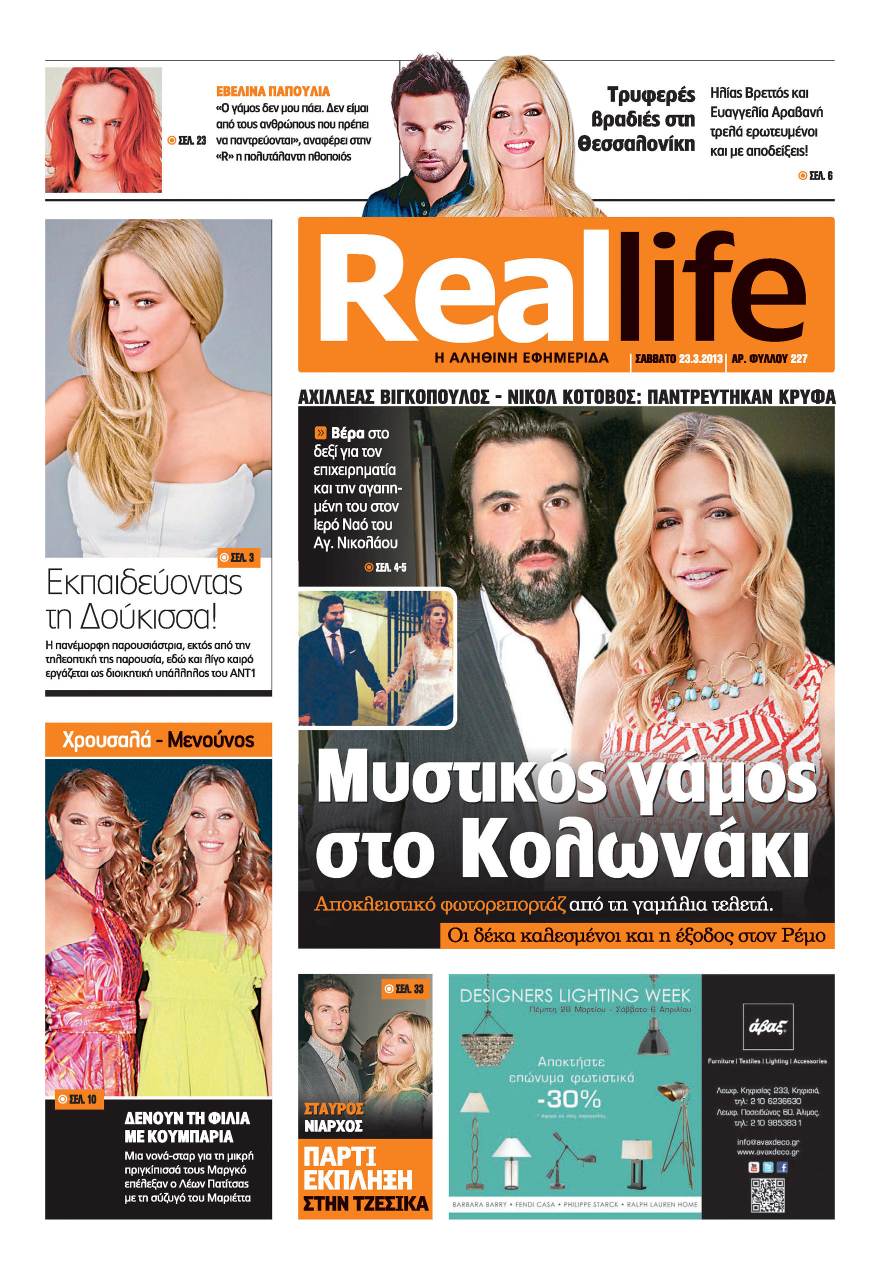 – Μυστικός γάμος στο Κολωνάκι. Αχιλλέας Βιγκόπουλος-Νικόλ Κοτοβός: Παντρεύτηκαν κρυφά. Αποκλειστικό φωτορεπορτάζ από τη γαμήλια τελετή. Οι δέκα καλεσμένοι και η έξοδος στον Ρέμο. Βέρα στο δεξί για τον επιχειρηματία και την αγαπημένη του στον Ιερό Ναό του Αγ. Νικολάου.