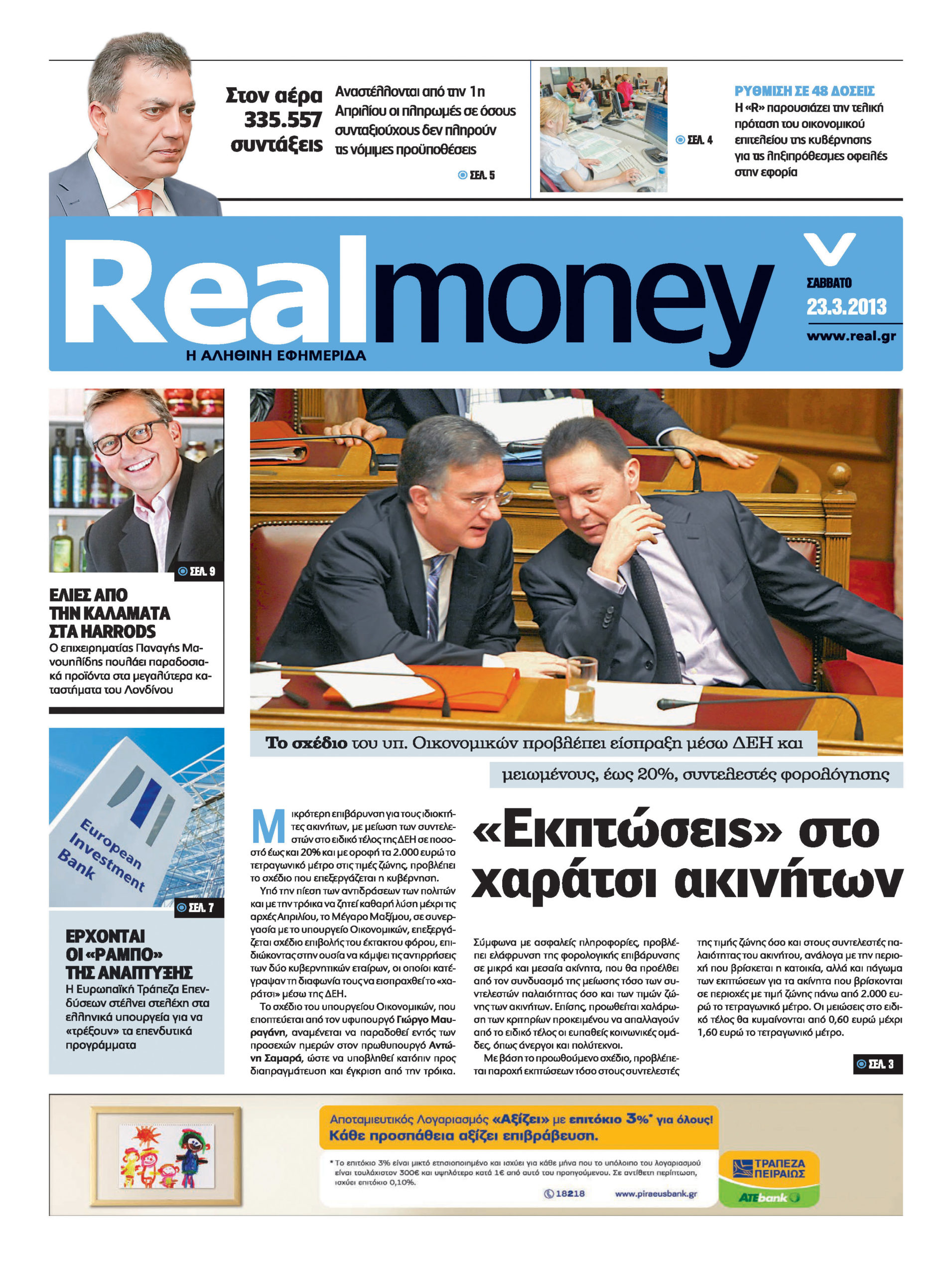 Επίσης η Realnews έχει πολυσέλιδο ρεπορτάζ για το παρασκήνιο των διαπραγματεύσεων Ευρώπης-Λευκωσίας, τους φόβους της Αθήνας και το σχέδιο για τις κυπριακές τράπεζες στην Ελλάδα. Στην εφημερίδα μιλά και ο Αρχιεπίσκοπος Κύπρου Χρυσόστομος, ο οποίος μεταξύ άλλων λέει: “Να κάτσουν στο σκαμνί όσοι έχουν ευθύνες”.