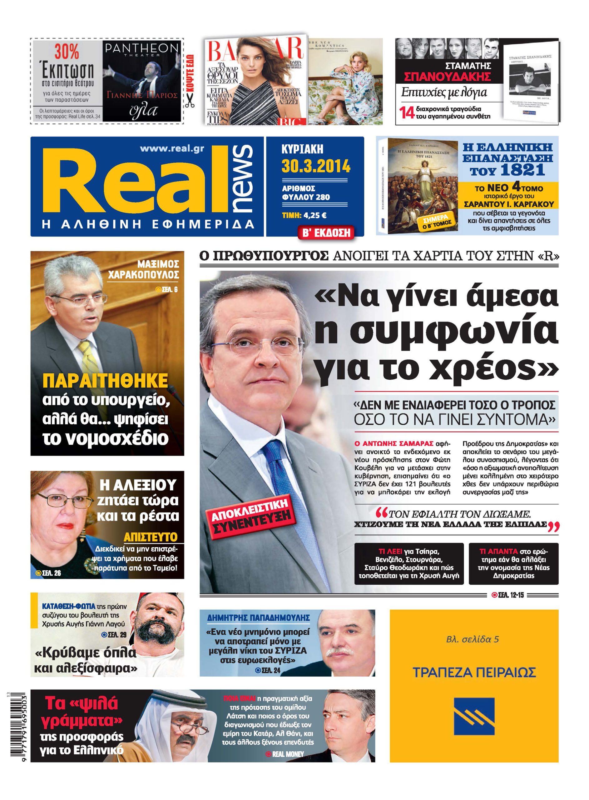Με τίτλο: “Να γίνει άμεσα η συμφωνία για το χρέος” και αποκλειστική συνέντευξη του Πρωθυπουργού Αντώνη Σαμαρά κυκλοφορεί σήμερα η Realnews.