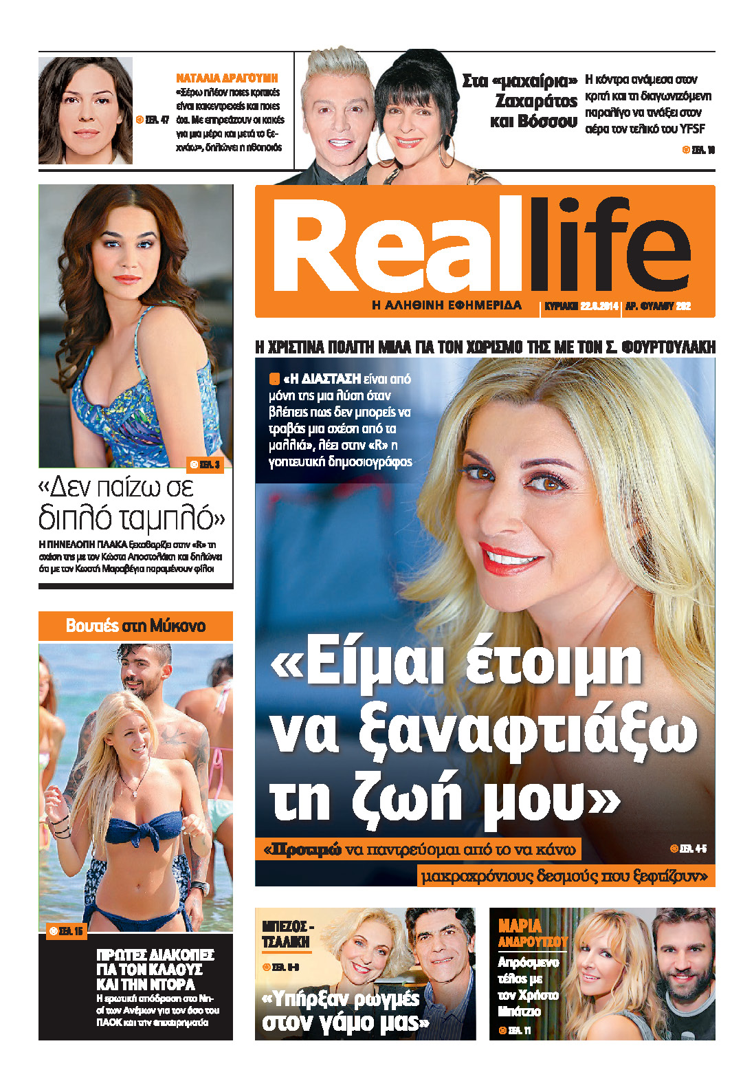 – “Είμαι έτοιμη να ξαναφτιάξω τη ζωή μου”. Η Χριστίνα Πολίτη μιλά για τον χωρισμό της με τον Σ. Φουρτουλάκη. “Η διάσταση είναι από μόνη της μια λύση όταν βλέπεις πως δεν μπορείς να τραβάς μια σχέση από τα μαλλιά” λέει στην “R” η γοητευτική δημοσιογράφος. “Προτιμώ να παντρεύομαι από το να κάνω μακροχρόνιους δεσμούς που ξεφτίζουν”.