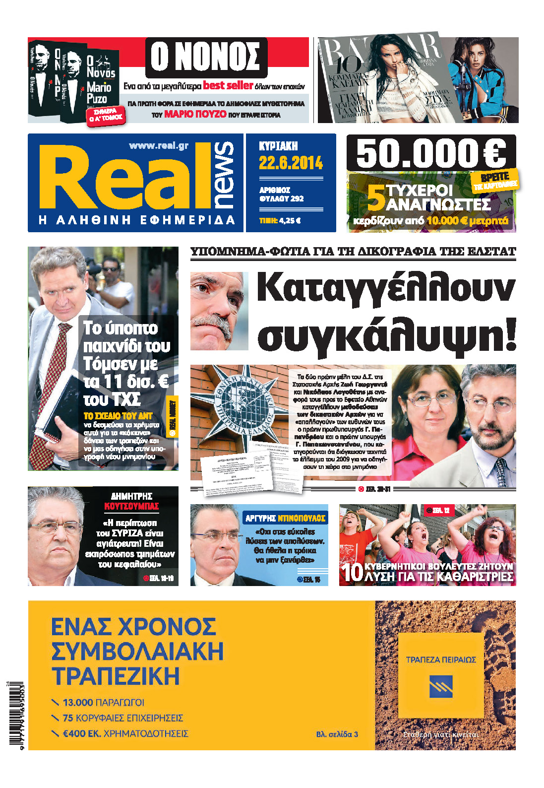 Με τίτλο: “Καταγγέλλουν συγκάλυψη!” κυκλοφορεί σήμερα η Realnews, η οποία φέρνει στη δημοσιότητα υπόμνημα-φωτιά για τη δικογραφία της ΕΛΣΤΑΤ. Σύμφωνα με το αποκαλυπτικό ρεπορτάζ της εφημερίδας: “τα δυο πρώην μέλη του Δ.Σ της Στατιστικής Υπηρεσίας Ζωή Γεωργαντά και Νικόλαος Λογοθέτης με αναφορά τους προς το Εφετείο Αθηνών καταγγέλλουν μεθοδεύσεις των δικαστικών Αρχών για να “απαλλαγούν” των ευθυνών τους ο πρώην πρωθυπουργός Γιώργος Παπανδρέου και ο πρώην υπουργός Γιώργος Παπακωνσταντίνου, που κατηγορούνται ότι διόγκωσαν τεχνητά το έλλειμμα του 2009 για να οδηγήσουν τη χώρα στο μνημόνιο”.