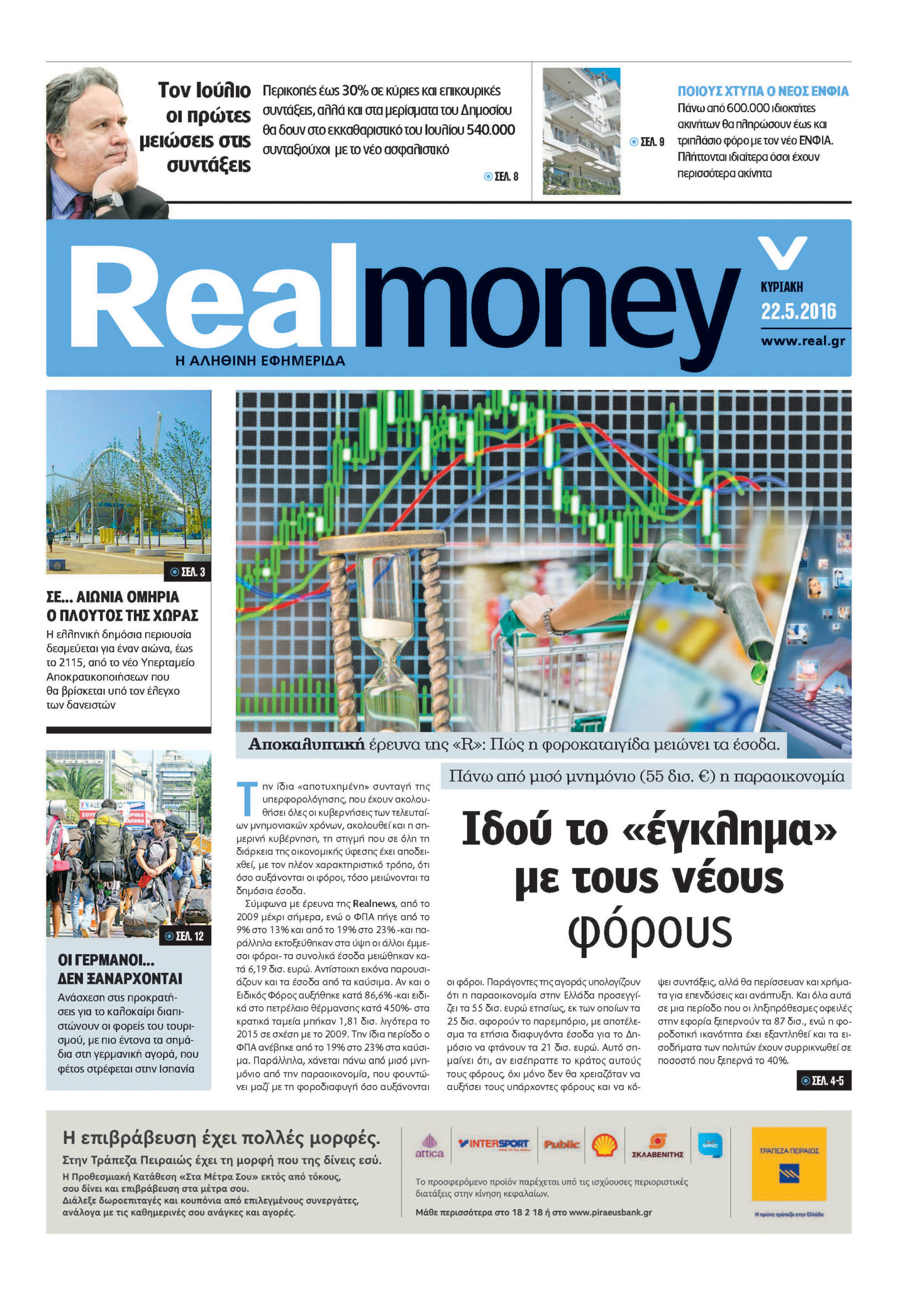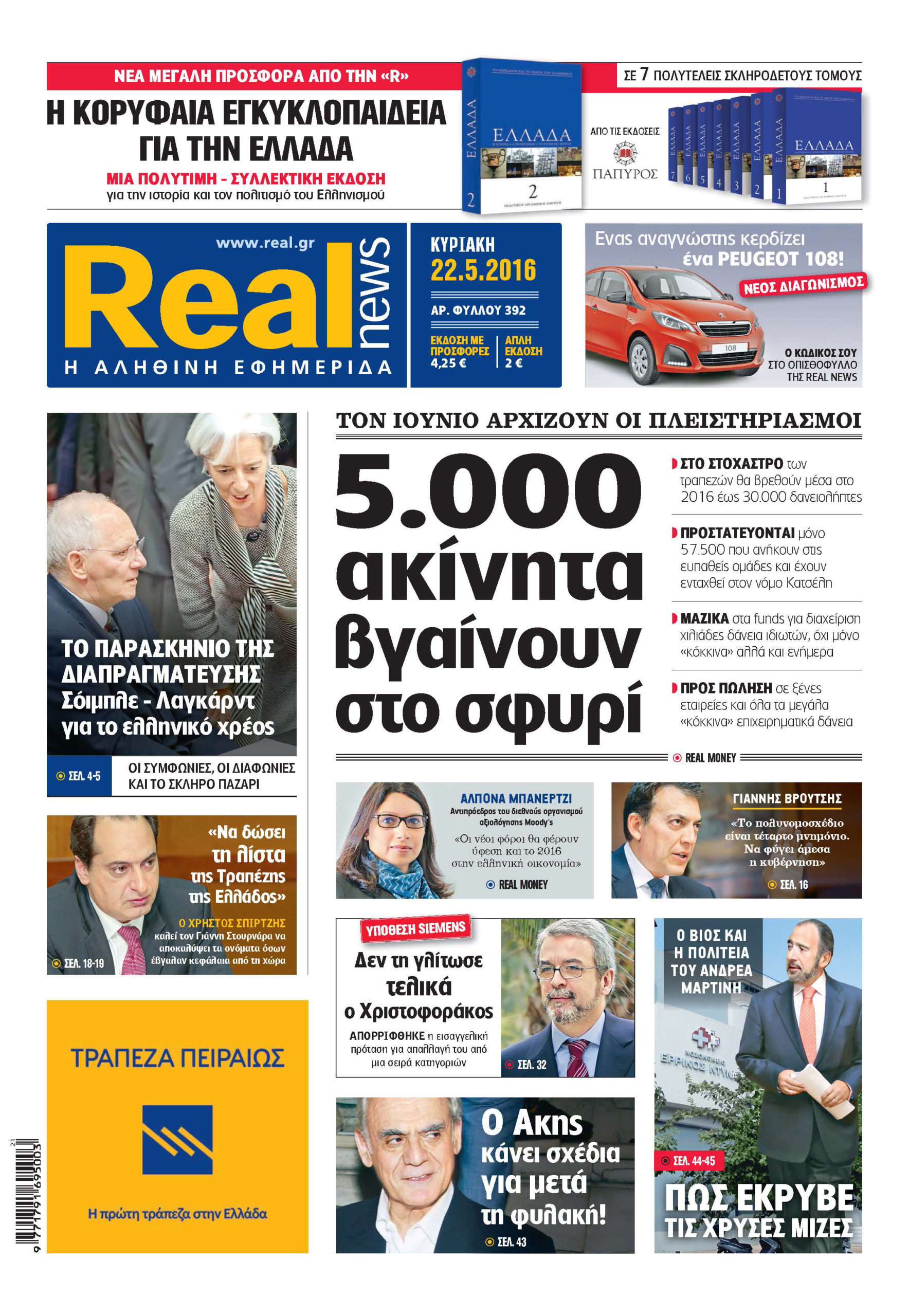 Με τίτλο: “5.000 ακίνητα βγαίνουν στο σφυρί” κυκλοφορεί σήμερα η Realnews, η οποία αποκαλύπτει ότι “τον Ιούνιο αρχίζουν οι πλειστηριασμοί”. Σύμφωνα με το ρεπορτάζ της εφημερίδας “στο στόχαστρο των τραπεζών θα βρεθούν μέσα στο 2016 έως 30.000 δανειολήπτες”, ενώ όπως διευκρινίζει η Realnews: “προστατεύονται μόνο 57.500 που ανήκουν στις ευπαθείς ομάδες και έχουν ενταχθεί στον νόμο Κατσέλη”. Η εφημερίδα σημειώνει ακόμη: “Μαζικά στα funds για διαχείριση χιλιάδες δάνεια ιδιωτών, όχι μόνο «κόκκινα» αλλά και ενήμερα. Προς πώληση σε ξένες εταιρείες και όλα τα μεγάλα «κόκκινα» επιχειρηματικά δάνεια”.