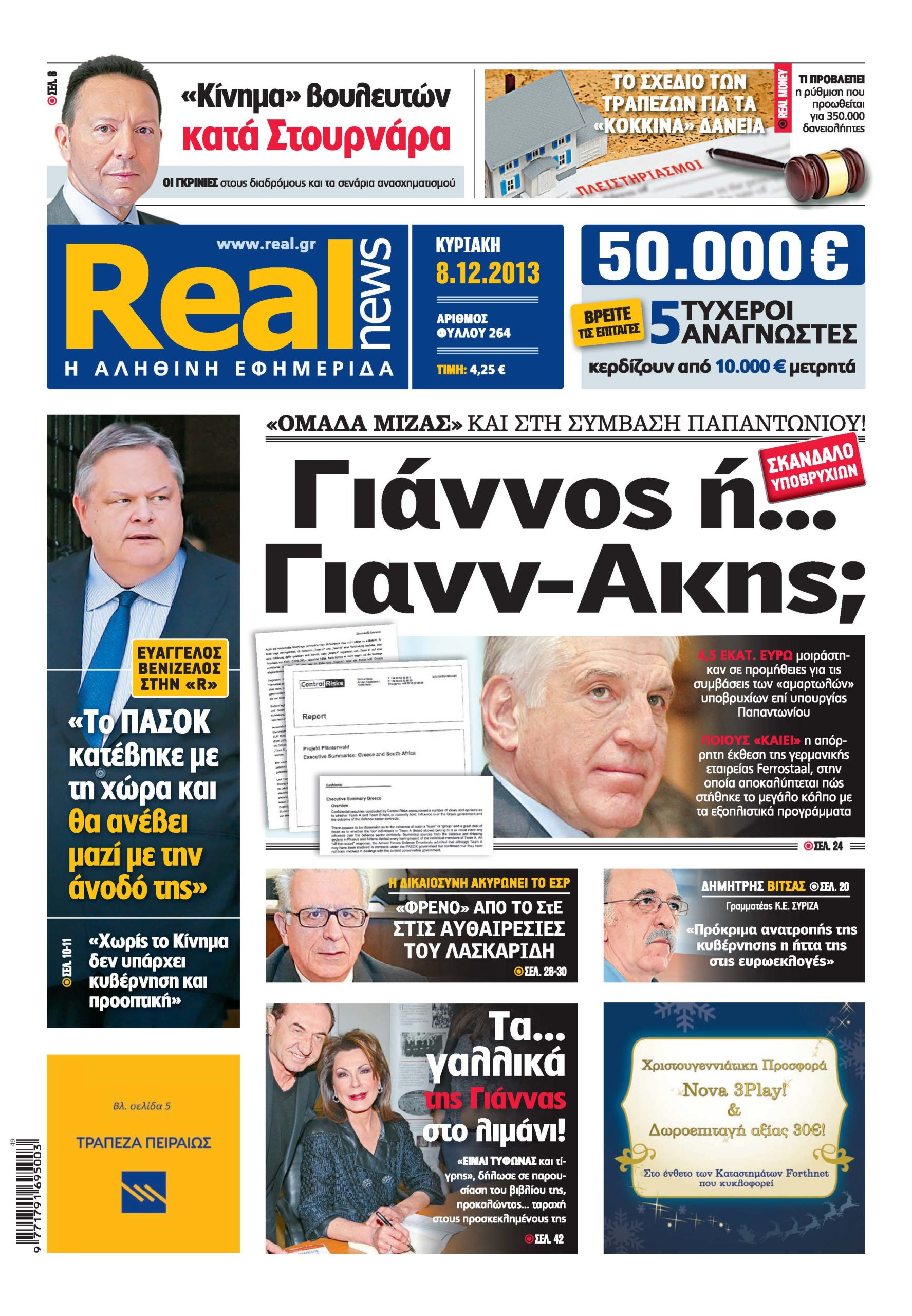 Με τίτλο: “Γιάννος ή…Γιανν-Ακης;” κυκλοφορεί σήμερα η Realnews, η οποία αναφέρεται στο σκάνδαλο των υποβρυχίων και επισημαίνει: “ομάδα μίζας και στη σύμβαση Παπαντωνίου!”. Η εφημερίδα σημειώνει ότι “4,5 εκατ. ευρώ μοιράστηκαν σε προμήθειες για τις συμβάσεις των “αμαρτωλών” υποβρυχίων επί υπουργίας Παπαντωνίου”, ενώ αναφέρεται και στο “ποιους “καίει” η απόρρητη έκθεση της γερμανικής εταιρείας Ferrostaal, στην οποία αποκαλύπτεται πώς στήθηκε το μεγάλο κόλπο με τα εξοπλιστικά προγράμματα”.