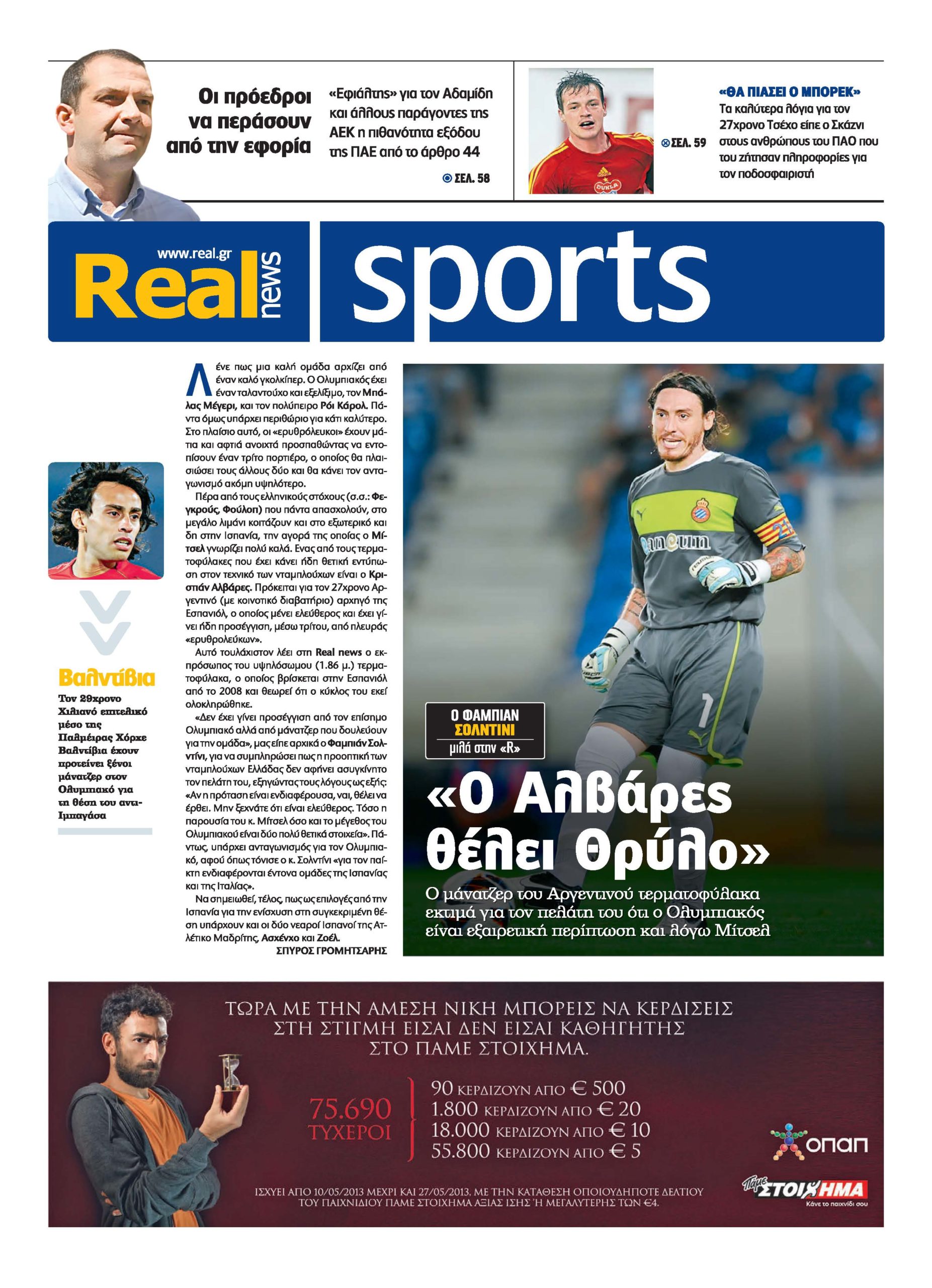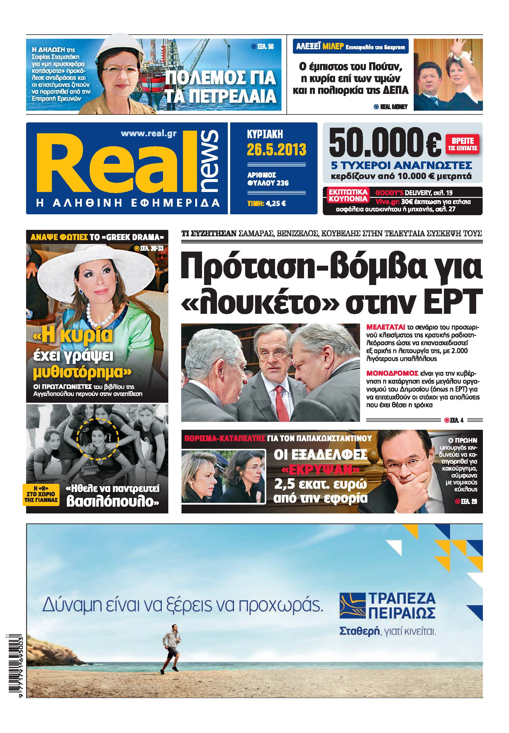 Με τίτλο: “Πρόταση-βόμβα για “λουκέτο” στην ΕΡΤ” κυκλοφορεί σήμερα η Realnews, η οποία αποκαλύπτει τι συζήτησαν Σαμαράς, Βενιζέλος, Κουβέλης στην τελευταία σύσκεψή τους. Σύμφωνα με το ρεπορτάζ της εφημερίδας, από την πλευρά της κυβέρνησης “μελετάται το σενάριο του προσωρινού κλεισίματος της κρατικής ραδιοτηλεόρασης ώστε να επανασχεδιαστεί εξ αρχής η λειτουργία της με 2000 λιγότερους υπαλλήλους”. Για την κυβέρνηση “είναι μονόδρομος η κατάργηση ενός μεγάλου οργανισμού του Δημοσίου (όπως η ΕΡΤ) για να επιτευχθούν οι στόχοι για απολύσεις που έχει θέσει η τρόικα”.