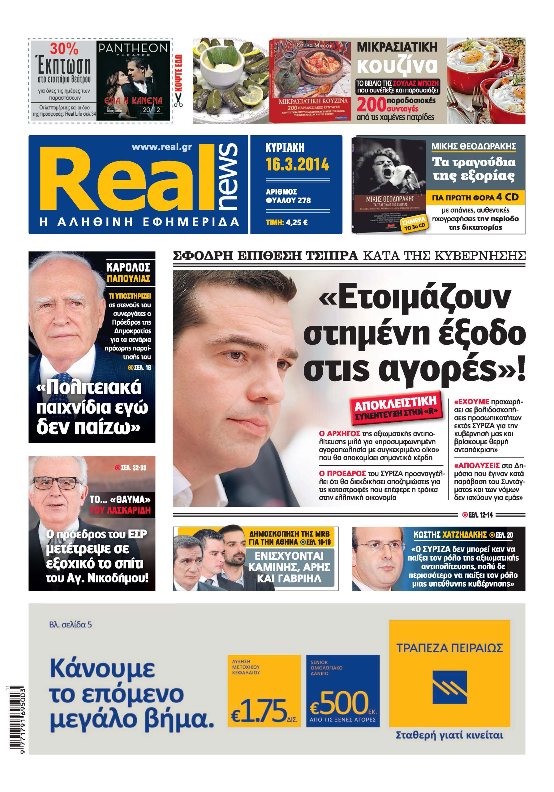 Με αποκλειστική συνέντευξη του Αλέξη Τσίπρα και τίτλο: “Ετοιμάζουν στημένη έξοδο στις αγορές”! κυκλοφορεί σήμερα η Realnews. O αρχηγός της αξιωματικής αντιπολίτευσης εξαπολύει σφοδρή επίθεση κατά της κυβέρνησης και μιλά για “προσυμφωνημένη αγοραπωλησία με συγκεκριμένο οίκο” που θα αποκομίσει σημαντικά κέρδη. Ο Πρόεδρος του ΣΥΡΙΖΑ προαναγγέλλει ότι θα διεκδικήσει αποζημιώσεις για τις καταστροφές που επέφερε η τρόικα στην ελληνική οικονομία.
