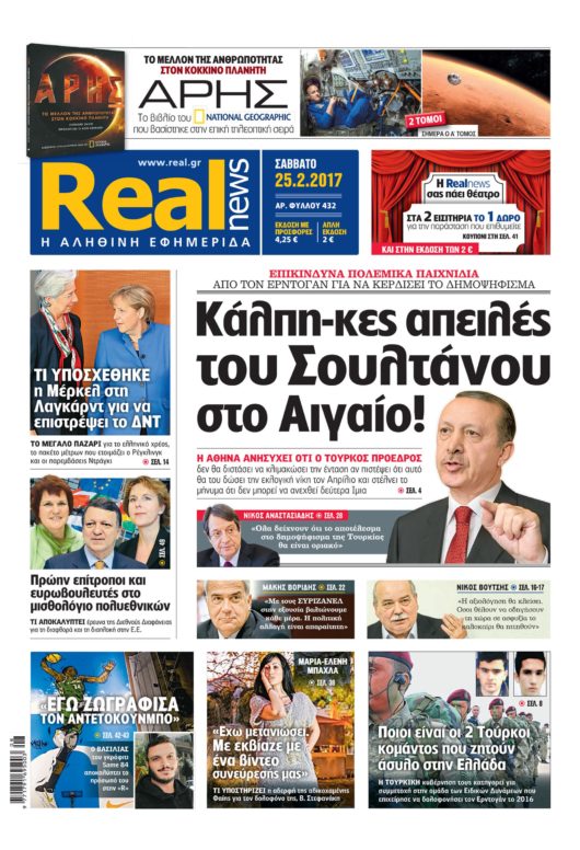 Με τίτλο: «Κάλπη-κες απειλές του Σουλτάνου στο Αιγαίο!» κυκλοφορεί η Realnews, η οποία αυτήν την εβδομάδα βρίσκεται στα περίπτερα, εκτάκτως από το Σάββατο. Η εφημερίδα κάνει λόγο για «επικίνδυνα πολεμικά παιχνίδια από τον Ερντογάν για να κερδίσει το δημοψήφισμα».