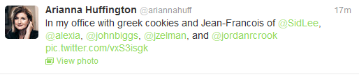 “Είμαι στο γραφείο με ελληνικά κουλουράκια”, έγραψε πριν από λίγο η γνωστή ελληνοαμερικανίδα εκδότρια Αριάνα Χάφινγκτον στο Twitter, ανεβάζοντας και μια φωτογραφία.