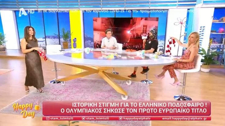 Η Σταματίνα Τσιμτσιλή και ο Κώστας Φραγκολιάς έκαναν πανηγυρική έναρξη στο Happy Day. Η παρουσιάστρια του Alpha έδωσε τα συγχαρητήριά της στον Ολυμπιακό για την ιστορική του νίκη επί της Φιορεντίνα, ενώ ο Κώστας Φραγκολιάς είπε ένα από τα συνθήματα των Ερυθρόλευκων χρησιμοποιώντας έναν… τηλεβόα.