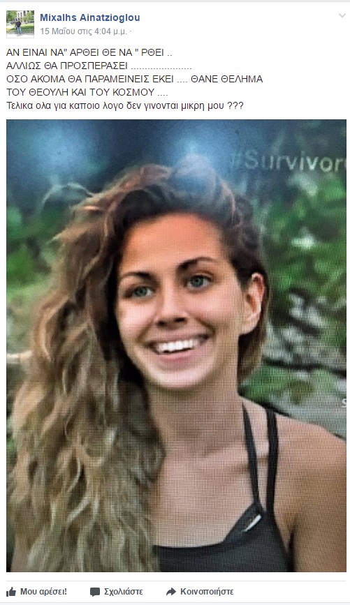 Μια αινιγματική ανάρτηση στον προσωπικό του λογαριασμό στο Facebook, έκανε ο πατέρας της Ελισάβετ Αϊνατζιόγλου, η οποία είναι υποψήφια προς αποχώρηση, μαζί με τη Σάρα Εσκενάζη και τον Γιάννη Σπαλιάρα.