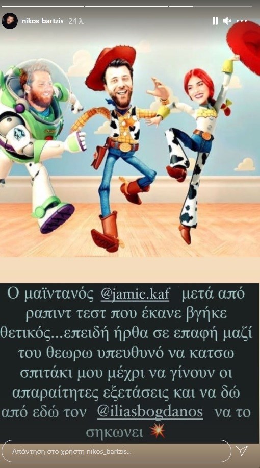 Από την άλλη πλευρά, ο Νίκος Μπάρτζης έγραψε στο δικό του προφίλ στο Instagram: «Ο μαϊντανός James Καφετζής μετά από ράπιντ τεστ που έκανε βγήκε θετικός…επειδή ήρθα σε επαφή μαζί του θεωρώ υπεύθυνο να κάτσω σπιτάκι μου μέχρι να γίνουν οι απαραίτητες εξετάσεις και να δω από εδώ τον Ηλία Μπόγδανο να το σηκώσει».