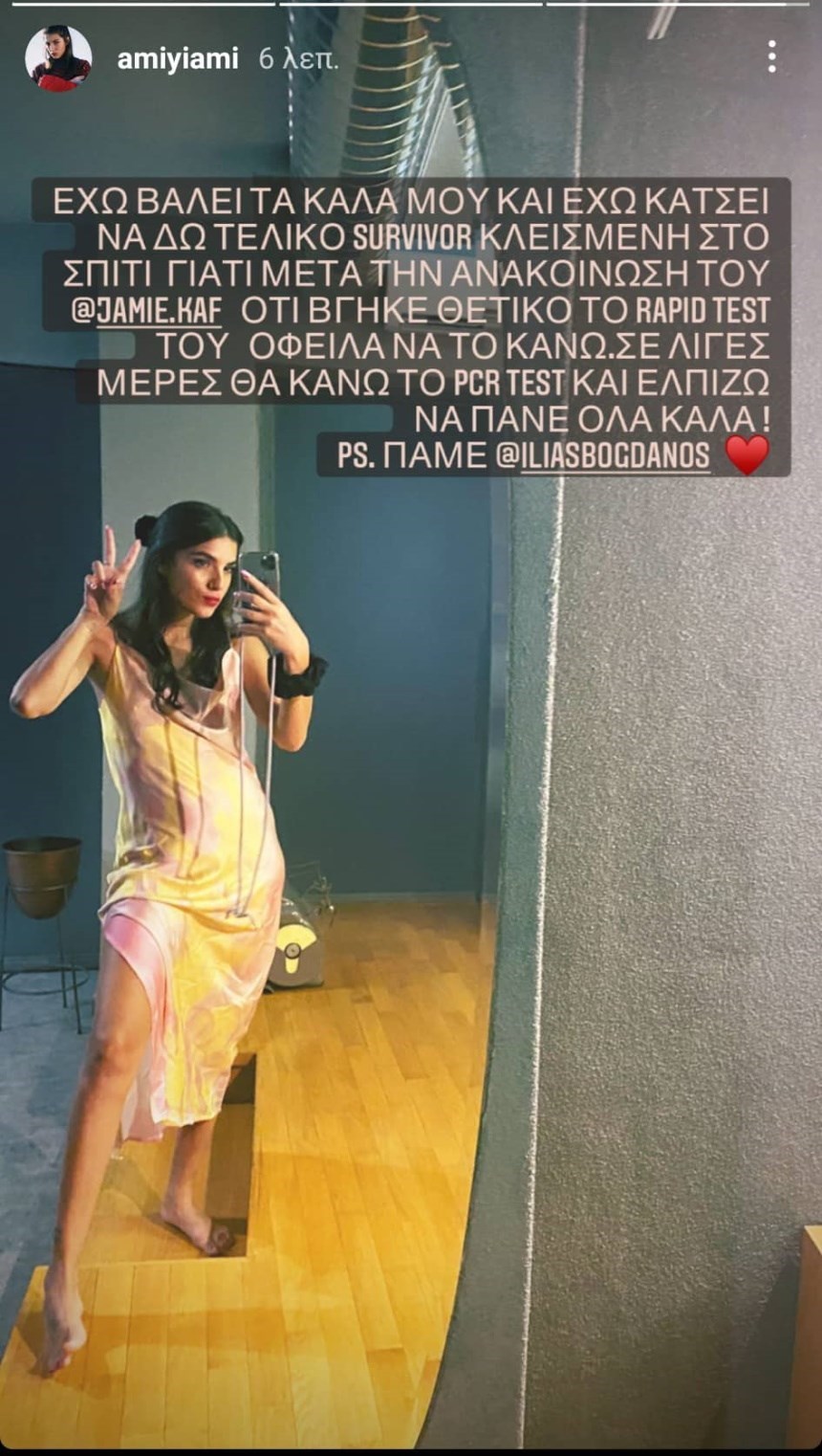 «Έχω βάλει τα καλά μου και έχω κάτσει να δω τελικό Survivor κλεισμένη στο σπίτι γιατί μετά την ανακοίνωση του James ότι βγήκε θετικό το Rapid Test του όφειλα να το κάνω. Σε λίγες ημέρες θα κάνω το PCR τεστ και ελπίζω να πάνε όλα καλά! Πάμε Ηλία!», έγραψε η Άννα Μαρία Βέλλη στον προσωπικό της λογαριασμό στο Instagram.