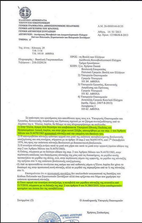 “Αναλυτικά, το κείμενο του Υπουργείου Οικονομικών το αναρτώ εδώ. Η δική μου απάντηση σε σας (και σε κανέναν άλλον) είναι: 1. Τη σύνταξη αυτή την σταμάτησε η χούντα και δεν καταβαλλόταν επί 7 χρόνια. 2. Παρ’ όλο που, ως παντρεμένη, είχα νόμιμο δικαίωμα στο ¼ της σύνταξης, ποτέ δεν εισέπραξα αυτά τα χρήματα όσο διαρκέσανε οι δυο γάμοι μου (σύνολο 12 χρόνια). Κι αυτό το έπραττα, με βάση το προσωπικό μου αξιακό σύστημα. 3. Με την είσοδο της χώρας στο μνημόνιο, έκρινα σωστό να μην προχωρήσω σε διαδικασίες που θα μου επέτρεπαν τη συνέχιση της καταβολής της – σε χρόνια τόσο δύσκολα για τον τόπο μας. Τέλος, τονίζω ότι η σύνταξη ήταν απολύτως νόμιμη και αυτό προκύπτει από όλα τα σχετικά έγγραφα. Δεν έχω να προσθέσω κάτι άλλο. Σας ευχαριστώ!”, τονίζει η Έλενα Ακρίτα.
