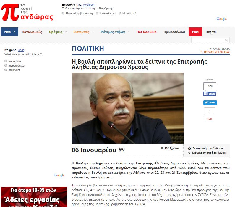 Στο δημοσίευμα υπό τον τίτλο «Η Βουλή αποπληρώνει τα δείπνα της Επιτροπής» αναφέρονται χαρακτηριστικά τα εξής: «Η Βουλή αποπληρώνει τα δείπνα της Επιτροπής Αλήθειας Δημοσίου Χρέους. Με απόφαση του προέδρου, Νίκου Βούτση, πληρώνονται λίγο περισσότερα από 1.000 ευρώ για τα δείπνα που παρέθεσε η Βουλή σε εστιατόρια της Αθήνας, στις 22, 23 και 24 Σεπτεμβρίου, όταν έγιναν και οι τελευταίες συνεδριάσεις.