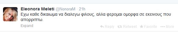 Η Ελεονώρα Μελέτη απάντησε μέσω twitter στις δηλώσεις της Λίτσας Πατέρα ότι έχει κάθε δικαίωμα να επιλέγει φίλους.