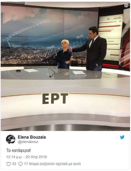 Η αθλητικογράφος αντιμετωπίζοντας το συμβάν με χιούμορ, ανέβασε μια φωτογραφία στον προσωπικό της λογαριασμό στο Twitter, που τη δείχνει να κάθεται στη θέση του παρουσιαστή των ειδήσεων, ενώ ο Αντώνης Αλαφογιώργος στέκεται όρθιος και αμήχανος δίπλα της.