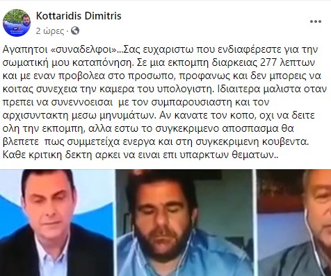 Λανθασμένη ήταν τελικά η εντύπωση που έδωσε ο Δημήτρης Κοτταρίδης κατά τη διάρκεια της εκπομπής της ΕΡΤ “Από τις έξι”. Ο δημοσιογράφος βγήκε στην εκπομπή από το σπίτι του μέσω skype και κάποια στιγμή έδωσε την εντύπωση στους τηλεθεατές πως έκλειναν τα μάτια του. Με ανάρτησή του στην προσωπική του σελίδα στο Facebook, ο παρουσιαστής ξεκαθάρισε ότι κοιτούσε χαμηλά, καθώς βρισκόταν σε επικοινωνία με τον αρχισυντάκτη της εκπομπής και τον συμπαρουσιαστή του Γιάννη Πιτταρά.