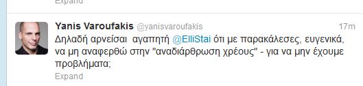 “Δηλαδή αρνείσαι αγαπητή Έλλη Στάη ότι με παρακάλεσες, ευγενικά, να μην αναφερθώ στην “αναδιάρθρωση χρέους; Για να μην έχουμε προβλήματα;” έγραψε χαρακτηριστικά ο Γιάννης Βαρουφάκης στον προσωπικό του λογαριασμό στο twitter.