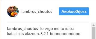Ο τελευταίος παίκτης που έφυγε από το Survivor πριν από την ένωση των δύο ομάδων, ήταν ο Λάμπρος Χούτος.Τον ποδοσφαιριστή, τον πρότεινε προς αποχώρηση ο φίλος του Βο, ο οποίος μάλιστα δήλωσε ότι μετάνιωσε για αυτό και όπως είπε ήταν σαν να ψηφίζει τον εαυτό του.Όπως φαίνεται, ο Λάμπρος Χούτος δεν έχει κρατήσει κακία και κάνει πλάκα γι’ αυτό, ανεβάζοντας στον προσωπικό του λογαριασμό στο Instagram μία φωτογραφία με τους δυο τους, ενώ ακόμα ταξίδευαν προς τον Άγιο Δομίνικο, δυόμιση μήνες πριν. Μάλιστα, συνόδευσε τη φωτογραφία με τη λεζάντα: “Το έργο είναι το ίδιο, οι καταστάσεις αλλάζουν. 3, 2, 1…booo”.
