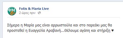 Την είδηση ανακοίνωσε η προσωπική σελίδα της εκπομπής “Φώτης και Μαρία Live” στο facebook.
