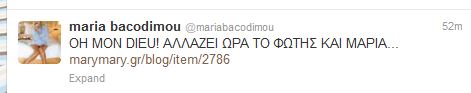 Η Μαρία Μπακοδήμου σχολίασε στον προσωπικο της λογαριασμό στο twitter για την εκπομπή της ‘Φώτης και Μαρία’: “Οh mon dieu! Αλλάζει ώρα το ‘Φώτης και Μαρία’. Θα ήθελα να ξέρετε ότι το ραντεβού μας αλλάζει ώρα. Tο ‘Φώτης και Μαρία’ από τη νέα σεζόν θα είναι στον αέρα του Star από τις 3.00 μέχρι τις 5.00 το απόγευμα. Άντε και καλή μας χρονιά!”.