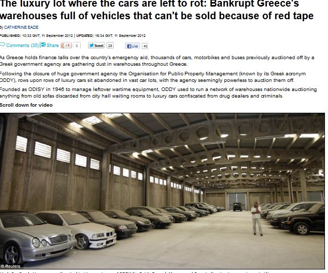 Εκτενές αφιέρωμα στα αζήτητα πολυτελή οχήματα που σκονίζονται στην αποθήκη του ΟΔΔΥ πραγματοποίησε η βρετανική εφημερίδα Daily Mail.Ο αρθογράφος επικεντρώθηκε φυσικά στο πως λόγω της οικονομικής κρίσης πολυτελή οχήματα και μοτοσικλέτες δεν βρίσκουν ιδιοκτήτες. Το ρεπορτάζ συνοδεύεται και από πλούσιο φωτογραφικό υλικό.