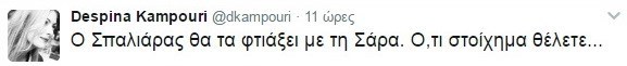 «Ο Σπαλιάρας θα τα φτιάξει με τη Σάρα. Ό,τι στοίχημα θέλετε…», έγραψε στο Twitter.Δείτε το tweet: