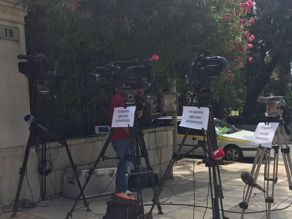 Με τη φράση «το μαύρο δεν έχει αποχρώσεις» σε χαρτιά κολλημένα πάνω στις κάμερες τους διαμαρτύρονται για δεύτερη ημέρα οι τεχνικοί των τηλεοπτικών συνεργείων που καλύπτουν τα σημερινά ρεπορτάζ.