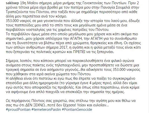 Ο Σάκης Τανιμανίδης, έχει καταγωγή από τον Πόντο, και δηλώνει υπερήφανος για αυτό. Έτσι, τίμησε τη σημερινή ημέρα, καθώς η 19η Μαϊου, είναι η Ημέρα Μνήμης της Γενοκτονίας των Ποντίων.Ο παρουσιαστής, ανεβάζοντας μία φωτογραφία στον προσωπικό του λογαριασμό στο instagram, η οποία απεικονίζει τον ίδιο μαζί με τον πατέρα του Στέφανο, έσπευσε να απαντήσει σε όσους τον έκριναν για την προβολή του σημερινού επεισοδίου στο Survivor, με τον δεύτερο αγώνα μεταξύ Ελλάδας και Τουρκίας.«Η αλήθεια είναι ότι πιστεύω κι εγώ πως θα έπρεπε να παίξει το συγκεκριμένο επεισόδιο μια άλλη ημερομηνία (το γύρισμα έγινε 4 μέρες πριν), αλλά δεν είμαι εγώ αυτός που αποφασίζει τις προβολές. Και όπως είπα παραπάνω, είναι κρίμα να αφήνουμε ένα απλό παιχνίδι να επισκιάζει την σημασία της ημέρας», έγραψε χαρακτηριστικά ο παρουσιαστής.Ενώ, συνέχισε λέγοντας ότι “Ως περήφανος Πόντιος σας χαιρετώ, σας στέλνω την αγάπη μου και θέλω να σας πω ότι ΔΕΝ ΞΕΧΝΩ… ποτέ δεν ξέχασα! Υείαν και ευλοΐαν…”Δείτε ολόκληρη την ανάρτηση: