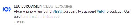 EBU: Παρακαλούμε αγνοείστε τις φήμες ότι η EBU συμφώνησε στη διακοπή μετάδοσης του προγράμματος της ΕΡΤ. Η θέση μας παραμένει αμετάβλητη.