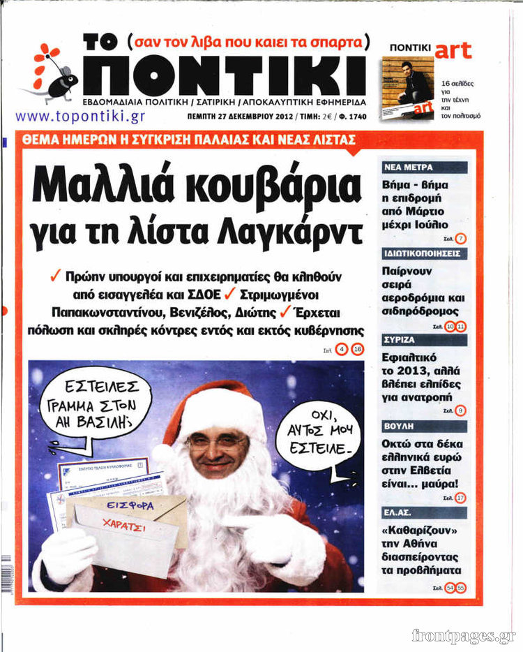 Η εφημερίδα “Το Ποντίκι” Enikos Newsroom 08:56, Πέμπτη 27 Δεκεμβρίου 2012 Media Η εφημερίδα “Το Ποντίκι” Το πρωτοσέλιδο της εφημερίδας “Το Ποντίκι”. ΕΦΗΜΕΡΙΔΑ ΤΟ ΠΟΝΤΙΚΙ ΠΡΩΤΟΣΕΛΙΔΟ Μοιράσου το: σχολίασε κι εσύ (0 σχόλια) Ακολουθήστε το enikos.gr στο Google News και μάθετε πρώτοι όλες τις ειδήσεις Δείτε όλες τις τελευταίες ειδήσεις από την Ελλάδα και τον Κόσμο στο enikos.gr Ειδήσεις Ροή Ειδήσεων 3 ώρες πριν Ανυποχώρητοι οι αγρότες: Δεν πάνε στο Μαξίμου, κλιμακώνουν τις κινητοποιήσεις – Ποια είναι τα αιτήματά τους 2 ώρες πριν ΟΠΕΚΕΠΕ-Κρήτη: Πώς δρούσε το κύκλωμα με τις παράνομες επιδοτήσεις – Τα ΚΥΔ, οι ψευδείς αιτήσεις και τα… «βράχια της Νορμανδίας» 2 ώρες πριν Διατλαντικό ρήγμα: Οι σχέσεις ΗΠΑ – Ευρώπης επιδεινώνονται λόγω του νέου δόγματος Τραμπ και της πίεσης που ασκεί στην Ουκρανία 4 ώρες πριν Διπλό φονικό στη Φοινικούντα: Δύο νέα πρόσωπα στο «κάδρο» των ερευνών – Οι αντιφάσεις στις καταθέσεις του ανιψιού 8 ώρες πριν Κρήτη: Θρίλερ με την εξαφάνιση του 33χρονου γιατρού – «Μου είπε “έλα πατέρα να μιλήσουμε γιατί δεν είμαι καλά”» 3 ώρες πριν Εκπληκτική ανακάλυψη σε αρχαία ελληνική πόλη: Βρέθηκε γυναικείο κεφάλι αγάλματος και οι αρχαιολόγοι εκτιμούν ότι μπορεί να συνδέεται με τη θεά Εστία 4 ώρες πριν Ύπνος: 9 πράγματα που μπορείτε να κάνετε πριν κοιμηθείτε για να ξυπνάτε πιο χαρούμενοι το πρωί, σύμφωνα με ειδικούς 5 ώρες πριν Αριθμολογία: Οι άνθρωποι που έχουν γεννηθεί αυτές τις 4 ημερομηνίες, δεν αντέχουν να κάνουν μία κλασική δουλειά γραφείου 6 ώρες πριν Χριστουγεννιάτικο δέντρο: Το έξυπνο κόλπο με τα στολίδια για να φαίνεται πιο γεμάτο 24 λεπτά πριν Γιώργος Βαγιαννίδης: Δύο ασίστ από τον Έλληνα αμυντικό στη νίκη της «εξάσφαιρης» Σπόρτινγκ – Δείτε βίντεο 39 λεπτά πριν ΗΠΑ: Τουλάχιστον δύο νεκροί και αρκετοί τραυματίες ύστερα από ένοπλη επίθεση στο Πανεπιστήμιο Μπράουν 53 λεπτά πριν ΗΠΑ: Αναγκαστική προσγείωση αεροσκάφους της United Airlines στην Ουάσινγκτον εξαιτίας βλάβης σε κινητήρα 1 ώρα πριν Super League: Μόνος τέταρτος ο Λεβαδειακός, η Κηφισιά πέρασε τον Άρη – Η βαθμολογία και το πρόγραμμα της 14ης αγωνιστικής 1 ώρα πριν Χρήστος Ζαφείρης: Αποθεώθηκε στο «αντίο» του στην Σλάβια Πράγας και τώρα… ΠΑΟΚ ENIKOS NETWORK «Με αυτόν τον τρόπο κατάφερα να απογειώσω τη σεξουαλική μου ζωή» – Τι αποκαλύπτει 40χρονη Πείτε «τέλος» στην ακμή χωρίς φάρμακα – Ειδικός αποκαλύπτει αποτελεσματική ρουτίνα περιποίησης Νέα εποχή για την Εγνατία Οδό – Τι αλλάζει με επενδύσεις 1,8 δισ. ευρώ Στάση εργασίας στα λεωφορεία την Τετάρτη 17 Δεκεμβρίου – Κανονικά τα περιαστικά δρομολόγια Σύγχρονος Νοστράδαμος: Προειδοποιεί για «μεγάλο γεγονός» τους επόμενους μήνες που θα συγκλονίσει τη Βρετανία και τον κόσμο Τεστ παρατηρητικότητας: Μπορείτε να βρείτε τις 3 διαφορές στις εικόνες με έναν πιγκουίνο σε 14 δευτερόλεπτα περισσότερα 22:56 , Σάββατο 13 Δεκεμβρίου 2025 «Το παιδί»: Η Άρτεμις κάνει μια μακάβρια ανακάλυψη – Τι θα δούμε στα επόμενα επεισόδια Μη χάσετε τις εξελίξεις στα νέα επεισόδια της μαύρης κοινωνικής κωμωδίας «Το παιδί», στην ΕΡΤ1... 22:16 , Σάββατο 13 Δεκεμβρίου 2025 Άγιος έρωτας- επόμενα επεισόδια: Ο Αντρέας μαθαίνει ότι ο Χάρης είναι γιος του Μια εβδομάδα γεμάτη καταιγιστικές εξελίξεις στα νέα επεισόδια της σειράς “Άγιος Έρωτας... 20:40 , Σάββατο 13 Δεκεμβρίου 2025 HOTΕΛ ΕΛVIRA: Η Ελβίρα προσπαθεί να βγάλει οριστικά από το μυαλό της τον Χάρι, απόψε στις 21:00 Σε προεκλογικό πυρετό βρίσκεται το νησί, στο νέο επεισόδιο τ