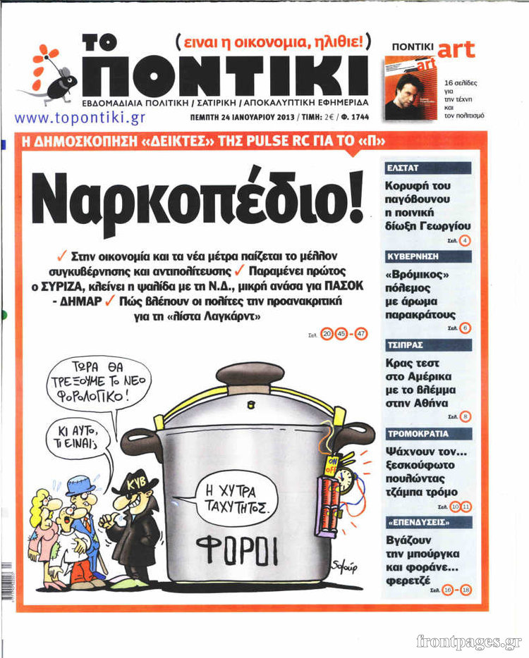 Η εφημερίδα “Το Ποντίκι” Enikos Newsroom 08:57, Πέμπτη 24 Ιανουαρίου 2013 Media Η εφημερίδα “Το Ποντίκι” ΕΦΗΜΕΡΙΔΑ ΤΟ ΠΟΝΤΙΚΙ ΠΡΩΤΟΣΕΛΙΔΟ Μοιράσου το: σχολίασε κι εσύ (0 σχόλια) Ακολουθήστε το enikos.gr στο Google News και μάθετε πρώτοι όλες τις ειδήσεις Δείτε όλες τις τελευταίες ειδήσεις από την Ελλάδα και τον Κόσμο στο enikos.gr Ειδήσεις Ροή Ειδήσεων 3 ώρες πριν Αυτή είναι η λίστα με τα αιτήματα των αγροτών – Το «όχι» στη συνάντηση στο Μαξίμου και η έκκληση της κυβέρνησης για διάλογο με ανοιχτούς δρόμους 1 ώρα πριν Απάτες με επιδοτήσεις από τον ΟΠΕΚΕΠΕ στην Κρήτη: Ξεκίνησε η μεταγωγή των 16 συλληφθέντων στην Αθήνα – Τι λένε οι δικηγόροι τους 3 ώρες πριν Κρήτη: Θρίλερ με την εξαφάνιση του 33χρονου γιατρού – «Μου είπε “έλα πατέρα να μιλήσουμε γιατί δεν είμαι καλά”» 2 ώρες πριν Αργυρούπολη: Απείλησε με… τσεκούρι άλλον οδηγό ύστερα από καβγά – Στο αυτοκίνητό του βρέθηκε και αεροβόλο 2 ώρες πριν ΗΠΑ: Οι πολίτες πιστεύουν ότι ο Τραμπ γνώριζε για τις παράνομες πράξεις του Επστάιν – Τι δείχνουν 2 δημοσκοπήσεις 2 ώρες πριν Γιατί δεν είστε ευτυχισμένοι: Τα 7 σημάδια που μαρτυρούν ότι αναζητάτε την πηγή της χαράς σε λάθος μέρη 5 ώρες πριν Το φινάλε του 2025 θα είναι μαγικό για 5 ζώδια – «Προαγωγές και νέες σχέσεις που θα διαρκέσουν μια ζωή» 9 ώρες πριν Ασθενής με νόσο του Crohn μοιράζεται τα 5 πράγματα που εύχεται να γνώριζε νωρίτερα για την πάθηση – «Τα συμπτώματα δεν περιορίζονται στο έντερο» 1 ώρα πριν Χριστουγεννιάτικο δέντρο: Το έξυπνο κόλπο με τα στολίδια για να φαίνεται πιο γεμάτο 6 λεπτά πριν Ισραήλ: Η στιγμή που εκτελεί με πύραυλο τον Ραάντ Σαάντ, Νο2 στην ηγεσία της Χαμάς – Πώς δικαιολογεί την νέα παραβίαση της εκεχειρίας 14 λεπτά πριν Κωνσταντοπούλου: Προσωπικά έχω σκίσει πολλά καλσόν – Έχω δώσει πολλές μάχες για τα δικαιώματα για να αφήσω να κακοποιούν την αλήθεια 22 λεπτά πριν Αριθμολογία: Οι άνθρωποι που έχουν γεννηθεί αυτές τις 4 ημερομηνίες, δεν αντέχουν να κάνουν μία κλασική δουλειά γραφείου 26 λεπτά πριν ΗΠΑ: Έψαχνε τον γιο του στο Ground Zero για έξι μήνες – 24 χρόνια αργότερα, η 11η Σεπτεμβρίου τον σκότωσε και αυτόν 33 λεπτά πριν Απάτη στο Ηράκλειο: Προσποιούνταν τον αντιδήμαρχο και ζητούσε χρήματα για παράβολα ENIKOS NETWORK «Με αυτόν τον τρόπο κατάφερα να απογειώσω τη σεξουαλική μου ζωή» – Τι αποκαλύπτει 40χρονη Πείτε «τέλος» στην ακμή χωρίς φάρμακα – Ειδικός αποκαλύπτει αποτελεσματική ρουτίνα περιποίησης Voucher 200 ευρώ: Ποιοι και πώς θα το λάβουν – Οι καταληκτικές ημερομηνίες για τις αιτήσεις και την εξαργύρωση Δώρο Χριστουγέννων: Ποιοι θα πάρουν περισσότερα χρήματα φέτος – Η προθεσμία καταβολής Σύγχρονος Νοστράδαμος: Προειδοποιεί για «μεγάλο γεγονός» τους επόμενους μήνες που θα συγκλονίσει τη Βρετανία και τον κόσμο Τεστ παρατηρητικότητας: Μπορείτε να βρείτε τις 3 διαφορές στις εικόνες με έναν πιγκουίνο σε 14 δευτερόλεπτα περισσότερα 18:00 , Σάββατο 13 Δεκεμβρίου 2025 Η Realnews στο www.pressreader.com Διαβάστε την ψηφιακή έκδοση της εφημερίδας στην οθόνη του κινητού, του tablet και του υπολογισ... 15:46 , Σάββατο 13 Δεκεμβρίου 2025 Τηλεθέαση (12/12): Ποιες εκπομπές της πρωινής ζώνης πήραν προβάδισμα την Παρασκευή; Συνεχίστηκε η «μάχη» στην πρωινή ζώνη την Παρασκευή 12 Δεκεμβρίου, όπως φαίνεται και στους πίν... 13:50 , Σάββατο 13 Δεκεμβρίου 2025 Η Realnews αυτής της Κυριακής Με τίτλο: «”Ενέσεις” ρευστότητας στους αγρότες» κυκλοφορεί, αυτήν την Κυριακή, η R... 12:49 , Σάββατο 13 Δεκεμβρίου 2025 Grand Hotel: Η Αλίκη συναντά τον Πέτρο