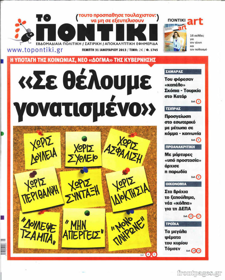 Η εφημερίδα “Το Ποντίκι” Enikos Newsroom 08:54, Πέμπτη 31 Ιανουαρίου 2013 Media Η εφημερίδα “Το Ποντίκι” Το πρωτοσέλιδο της εφημερίδας “Το Ποντίκι”. ΕΦΗΜΕΡΙΔΑ ΤΟ ΠΟΝΤΙΚΙ ΠΡΩΤΟΣΕΛΙΔΟ Μοιράσου το: σχολίασε κι εσύ (0 σχόλια) Ακολουθήστε το enikos.gr στο Google News και μάθετε πρώτοι όλες τις ειδήσεις Δείτε όλες τις τελευταίες ειδήσεις από την Ελλάδα και τον Κόσμο στο enikos.gr Ειδήσεις Ροή Ειδήσεων 5 ώρες πριν Αυτή είναι η λίστα με τα αιτήματα των αγροτών – Το «όχι» στη συνάντηση στο Μαξίμου και η έκκληση της κυβέρνησης για διάλογο με ανοιχτούς δρόμους 3 ώρες πριν Απάτες με επιδοτήσεις από τον ΟΠΕΚΕΠΕ στην Κρήτη: Ξεκίνησε η μεταγωγή των 16 συλληφθέντων στην Αθήνα – Τι λένε οι δικηγόροι τους 5 ώρες πριν Κρήτη: Θρίλερ με την εξαφάνιση του 33χρονου γιατρού – «Μου είπε “έλα πατέρα να μιλήσουμε γιατί δεν είμαι καλά”» 3 ώρες πριν Αργυρούπολη: Απείλησε με… τσεκούρι άλλον οδηγό ύστερα από καβγά – Στο αυτοκίνητό του βρέθηκε και αεροβόλο 2 ώρες πριν ΗΠΑ: Έψαχνε τον γιο του στο Ground Zero για έξι μήνες – 24 χρόνια αργότερα, η 11η Σεπτεμβρίου τον σκότωσε και αυτόν 57 λεπτά πριν Ύπνος: 9 πράγματα που μπορείτε να κάνετε πριν κοιμηθείτε για να ξυπνάτε πιο χαρούμενοι το πρωί, σύμφωνα με ειδικούς 2 ώρες πριν Αριθμολογία: Οι άνθρωποι που έχουν γεννηθεί αυτές τις 4 ημερομηνίες, δεν αντέχουν να κάνουν μία κλασική δουλειά γραφείου 4 ώρες πριν Γιατί δεν είστε ευτυχισμένοι: Τα 7 σημάδια που μαρτυρούν ότι αναζητάτε την πηγή της χαράς σε λάθος μέρη 3 ώρες πριν Χριστουγεννιάτικο δέντρο: Το έξυπνο κόλπο με τα στολίδια για να φαίνεται πιο γεμάτο 9 λεπτά πριν Διπλό φονικό στη Φοινικούντα: Δύο νέα πρόσωπα στο «κάδρο» των ερευνών – Οι αντιφάσεις στις καταθέσεις του ανιψιού 17 λεπτά πριν Η Κουταλένια: Η ιστορία ενός αυτιστικού κοριτσιού που βρίσκει παρηγοριά στη φωνή της Μαρίας Κάλλας ανεβαίνει στο θέατρο Μουσούρη 25 λεπτά πριν Αργυρούπολη: Έκλεψε το κινητό 74χρονου που επέβαινε σε συρμό του μετρό και… απαίτησε 100 ευρώ για να του το επιστρέψει 32 λεπτά πριν Φαίη Ξυλά: «Ήταν πολύ άσχημες περιπτώσεις – Δεν θα το άλλαζα, απλώς σίγουρα δεν θα το έκανα ξανά» 41 λεπτά πριν Άγιος έρωτας- επόμενα επεισόδια: Ο Αντρέας μαθαίνει ότι ο Χάρης είναι γιος του ENIKOS NETWORK «Με αυτόν τον τρόπο κατάφερα να απογειώσω τη σεξουαλική μου ζωή» – Τι αποκαλύπτει 40χρονη Πείτε «τέλος» στην ακμή χωρίς φάρμακα – Ειδικός αποκαλύπτει αποτελεσματική ρουτίνα περιποίησης Νέα εποχή για την Εγνατία Οδό – Τι αλλάζει με επενδύσεις 1,8 δισ. ευρώ Στάση εργασίας στα λεωφορεία την Τετάρτη 17 Δεκεμβρίου – Κανονικά τα περιαστικά δρομολόγια Σύγχρονος Νοστράδαμος: Προειδοποιεί για «μεγάλο γεγονός» τους επόμενους μήνες που θα συγκλονίσει τη Βρετανία και τον κόσμο Τεστ παρατηρητικότητας: Μπορείτε να βρείτε τις 3 διαφορές στις εικόνες με έναν πιγκουίνο σε 14 δευτερόλεπτα περισσότερα 22:16 , Σάββατο 13 Δεκεμβρίου 2025 Άγιος έρωτας- επόμενα επεισόδια: Ο Αντρέας μαθαίνει ότι ο Χάρης είναι γιος του Μια εβδομάδα γεμάτη καταιγιστικές εξελίξεις στα νέα επεισόδια της σειράς “Άγιος Έρωτας... 20:40 , Σάββατο 13 Δεκεμβρίου 2025 HOTΕΛ ΕΛVIRA: Η Ελβίρα προσπαθεί να βγάλει οριστικά από το μυαλό της τον Χάρι, απόψε στις 21:00 Σε προεκλογικό πυρετό βρίσκεται το νησί, στο νέο επεισόδιο της κωμωδίας του MEGA, HOTΕΛ ΕΛVIRA... 18:00 , Σάββατο 13 Δεκεμβρίου 2025 Η Realnews στο www.pressreader.com Διαβάστε την ψηφιακή έκδοση της εφημερίδας στην οθόνη του κινητού, του tablet και του υπολογισ... 15:46 , Σάββατο 13 Δεκεμβρίου 2025 Τηλεθέαση (12/