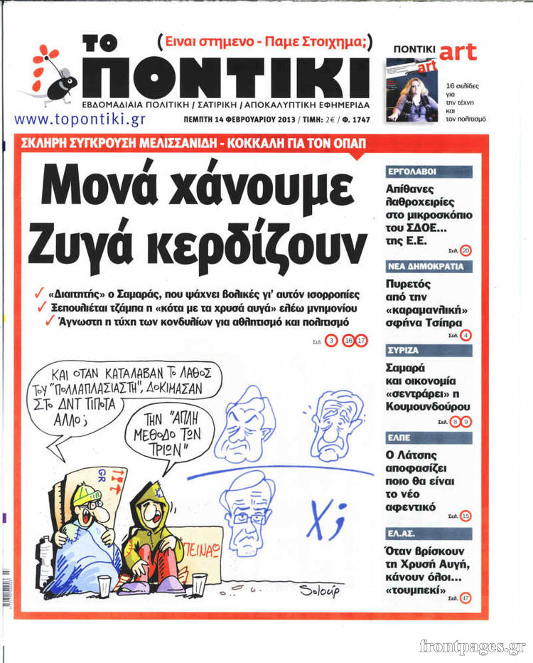 Η εφημερίδα “Το Ποντίκι” Enikos Newsroom 09:24, Πέμπτη 14 Φεβρουαρίου 2013 Media Η εφημερίδα “Το Ποντίκι” ΕΦΗΜΕΡΙΔΑ ΕΦΗΜΕΡΙΔΑ ΤΟ ΠΟΝΤΙΚΙ ΠΡΩΤΟΣΕΛΙΔΟ Μοιράσου το: σχολίασε κι εσύ (0 σχόλια) Ακολουθήστε το enikos.gr στο Google News και μάθετε πρώτοι όλες τις ειδήσεις Δείτε όλες τις τελευταίες ειδήσεις από την Ελλάδα και τον Κόσμο στο enikos.gr Ειδήσεις Ροή Ειδήσεων 10 λεπτά πριν Ανυποχώρητοι οι αγρότες: Δεν πάνε στο Μαξίμου, κλιμακώνουν τις κινητοποιήσεις – Ποια είναι τα αιτήματά τους 3 ώρες πριν Απάτες με επιδοτήσεις από τον ΟΠΕΚΕΠΕ στην Κρήτη: Ξεκίνησε η μεταγωγή των 16 συλληφθέντων στην Αθήνα – Τι λένε οι δικηγόροι τους 33 λεπτά πριν Διπλό φονικό στη Φοινικούντα: Δύο νέα πρόσωπα στο «κάδρο» των ερευνών – Οι αντιφάσεις στις καταθέσεις του ανιψιού 5 ώρες πριν Κρήτη: Θρίλερ με την εξαφάνιση του 33χρονου γιατρού – «Μου είπε “έλα πατέρα να μιλήσουμε γιατί δεν είμαι καλά”» 2 ώρες πριν ΗΠΑ: Έψαχνε τον γιο του στο Ground Zero για έξι μήνες – 24 χρόνια αργότερα, η 11η Σεπτεμβρίου τον σκότωσε και αυτόν 21 λεπτά πριν Εκπληκτική ανακάλυψη σε αρχαία ελληνική πόλη: Βρέθηκε γυναικείο κεφάλι αγάλματος και οι αρχαιολόγοι εκτιμούν ότι μπορεί να συνδέεται με τη θεά Εστία 1 ώρα πριν Ύπνος: 9 πράγματα που μπορείτε να κάνετε πριν κοιμηθείτε για να ξυπνάτε πιο χαρούμενοι το πρωί, σύμφωνα με ειδικούς 2 ώρες πριν Αριθμολογία: Οι άνθρωποι που έχουν γεννηθεί αυτές τις 4 ημερομηνίες, δεν αντέχουν να κάνουν μία κλασική δουλειά γραφείου 3 ώρες πριν Χριστουγεννιάτικο δέντρο: Το έξυπνο κόλπο με τα στολίδια για να φαίνεται πιο γεμάτο 6 λεπτά πριν ΟΦΗ – Πανσερραϊκός 3-0: Πήραν… ανάσα οι Κρητικοί 10 λεπτά πριν Ανυποχώρητοι οι αγρότες: Δεν πάνε στο Μαξίμου, κλιμακώνουν τις κινητοποιήσεις – Ποια είναι τα αιτήματά τους 16 λεπτά πριν Βουλή, Προϋπολογισμός 2026 – Γιάννης Κεφαλογιάννης: Στρατηγική επένδυση στην πρόληψη, την ανθεκτικότητα και την ασφάλεια των πολιτών 21 λεπτά πριν Εκπληκτική ανακάλυψη σε αρχαία ελληνική πόλη: Βρέθηκε γυναικείο κεφάλι αγάλματος και οι αρχαιολόγοι εκτιμούν ότι μπορεί να συνδέεται με τη θεά Εστία 25 λεπτά πριν «Το παιδί»: Η Άρτεμις κάνει μια μακάβρια ανακάλυψη – Τι θα δούμε στα επόμενα επεισόδια ENIKOS NETWORK «Με αυτόν τον τρόπο κατάφερα να απογειώσω τη σεξουαλική μου ζωή» – Τι αποκαλύπτει 40χρονη Πείτε «τέλος» στην ακμή χωρίς φάρμακα – Ειδικός αποκαλύπτει αποτελεσματική ρουτίνα περιποίησης Νέα εποχή για την Εγνατία Οδό – Τι αλλάζει με επενδύσεις 1,8 δισ. ευρώ Στάση εργασίας στα λεωφορεία την Τετάρτη 17 Δεκεμβρίου – Κανονικά τα περιαστικά δρομολόγια Σύγχρονος Νοστράδαμος: Προειδοποιεί για «μεγάλο γεγονός» τους επόμενους μήνες που θα συγκλονίσει τη Βρετανία και τον κόσμο Τεστ παρατηρητικότητας: Μπορείτε να βρείτε τις 3 διαφορές στις εικόνες με έναν πιγκουίνο σε 14 δευτερόλεπτα περισσότερα 22:56 , Σάββατο 13 Δεκεμβρίου 2025 «Το παιδί»: Η Άρτεμις κάνει μια μακάβρια ανακάλυψη – Τι θα δούμε στα επόμενα επεισόδια Μη χάσετε τις εξελίξεις στα νέα επεισόδια της μαύρης κοινωνικής κωμωδίας «Το παιδί», στην ΕΡΤ1... 22:16 , Σάββατο 13 Δεκεμβρίου 2025 Άγιος έρωτας- επόμενα επεισόδια: Ο Αντρέας μαθαίνει ότι ο Χάρης είναι γιος του Μια εβδομάδα γεμάτη καταιγιστικές εξελίξεις στα νέα επεισόδια της σειράς “Άγιος Έρωτας... 20:40 , Σάββατο 13 Δεκεμβρίου 2025 HOTΕΛ ΕΛVIRA: Η Ελβίρα προσπαθεί να βγάλει οριστικά από το μυαλό της τον Χάρι, απόψε στις 21:00 Σε προεκλογικό πυρετό βρίσκεται το νησί, στο νέο επεισόδιο της κωμωδίας του MEGA, HOTΕΛ Ε