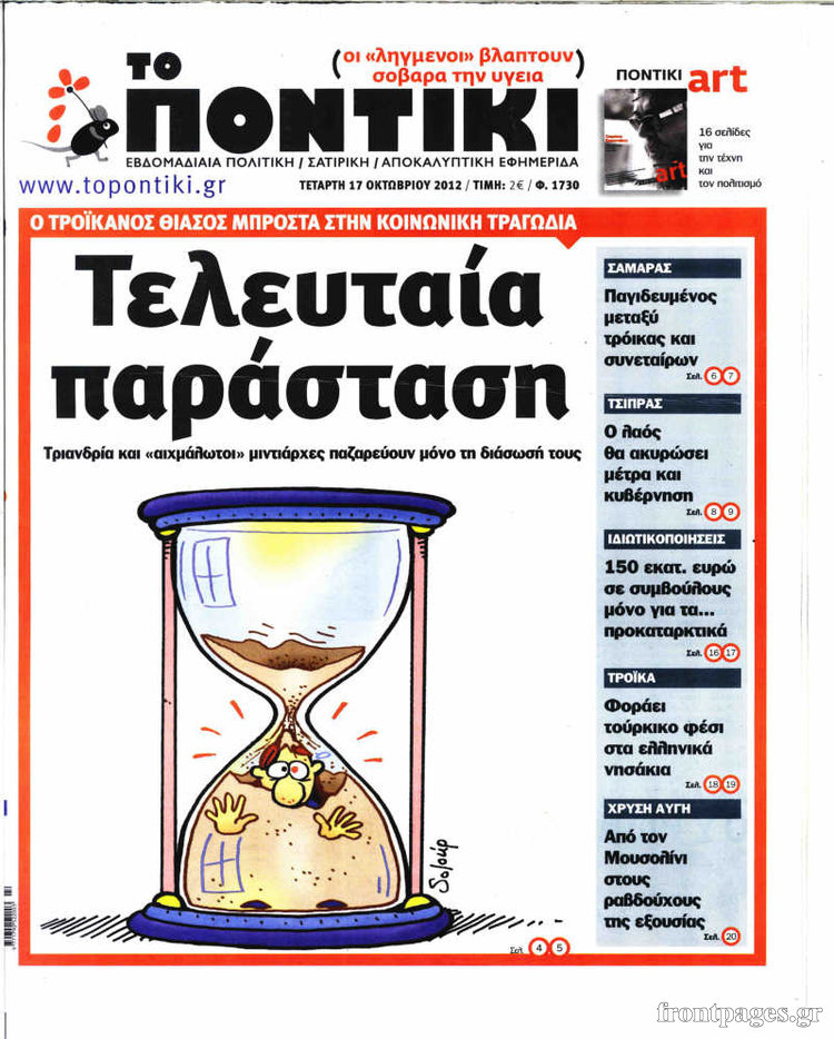 Η εφημερίδα “Το Ποντίκι” Enikos Newsroom 10:26, Πέμπτη 18 Οκτωβρίου 2012 Media Το πρωτοσέλιδο της εφημερίδας “Το Ποντίκι”. ΕΦΗΜΕΡΙΔΑ ΤΟ ΠΟΝΤΙΚΙ Μοιράσου το: σχολίασε κι εσύ (0 σχόλια) Ακολουθήστε το enikos.gr στο Google News και μάθετε πρώτοι όλες τις ειδήσεις Δείτε όλες τις τελευταίες ειδήσεις από την Ελλάδα και τον Κόσμο στο enikos.gr Ειδήσεις Ροή Ειδήσεων 7 ώρες πριν Μητσοτάκης: Αναγκαία η μεταρρύθμιση του πρωτογενούς τομέα – Τα 6 νέα μέτρα για το στεγαστικό και οι αναφορές σε «Ιθάκη» και «πολιτικούς του καναπέ» 6 ώρες πριν Δάνεια σε ελβετικό φράγκο: Τα βασικά σημεία της ρύθμισης – ανάσας για 40.000 δανειολήπτες – Αναλυτικός οδηγός με ερωτήσεις και απαντήσεις 6 ώρες πριν Κυψέλη: Εξιτήριο πήρε η 14χρονη μαθήτρια που μαχαιρώθηκε από την 16χρονη σε σχολείο – «Θέλω να βοηθήσω το παιδί, έχει μπλέξει με κακές παρέες» 6 ώρες πριν Τραμπ: Γιατί κατέθεσε τώρα την αγωγή κατά του BBC – Πώς η κίνησή του εξυπηρετεί το νέο δόγμα του για «αντίσταση» στην Ευρώπη, υπέρ των συντηρητικών 7 ώρες πριν ΟΠΕΚΕΠΕ – Παράνομες επιδοτήσεις: Ελεύθεροι με περιοριστικούς όρους και οι 7 κατηγορούμενοι που απολογήθηκαν σήμερα 6 ώρες πριν Ανακαλύφθηκε βυθισμένη πέτρινη κατασκευή ανοιχτά της Κριμαίας – Αποτελεί μέρος αρχαίας ελληνικής αποικίας 7 ώρες πριν Ύπνος: Αυτό μπορεί να είναι το χειρότερο λάθος για το βιολογικό ρολόι σας, σύμφωνα με ειδικό 8 ώρες πριν Αριθμολογία: Οι άνθρωποι που έχουν γεννηθεί αυτές τις 3 ημερομηνίες, προσελκύουν μεγάλη τύχη πριν από το τέλος του 2025 10 ώρες πριν Οι 7 συμπεριφορές που μαρτυρούν ότι ένας άνδρας επενδύει μακροπρόθεσμα σε μια σχέση 5 λεπτά πριν Παλαιστινιακό: «Η λύση των δύο κρατών είναι ο μόνος βιώσιμος δρόμος», τόνισε η Ελλάδα στο Συμβούλιο Ασφαλείας του ΟΗΕ 12 λεπτά πριν Ελένη Καρακάση: «Ένιωθα πολύ αδικημένη, δεν μπορούσα να ελέγξω τον εαυτό μου σε δύσκολες στιγμές» 20 λεπτά πριν Κλαούδια Σέινμπαουμ προς Ντόναλντ Τραμπ για φαιντανύλη: Να επιτεθούμε στα αίτια κατανάλωσης αντί να την κατατάσσουμε στα «όπλα μαζικής καταστροφής» 28 λεπτά πριν Ρωσία: Ουκρανική επίθεση με drones στο Κρασνοντάρ – Δύο τραυματίες, ζημιές σε σπίτια και διακοπή ρεύματος 37 λεπτά πριν Αντόνιο Ταγιάνι: Νομικά εμπόδια για τη χρήση των ρωσικών κεφαλαίων υπέρ της Ουκρανίας ENIKOS NETWORK Αίτημα ΙΣΑ για την εξαίρεση των προσωπικών γιατρών από τις κατ’ οίκον επισκέψεις Η σκανδιναβική μέθοδος στον ύπνο που μπορεί να σώσει έναν γάμο Πιερρακάκης: Ο προϋπολογισμός συμβάλλει ουσιαστικά στην ενίσχυση της αγοραστικής δύναμης της πλειονότητας των εργαζομένων e-ΕΦΚΑ: Παρατείνεται η προθεσμία για την υποβολή ΑΠΔ – Ποιους αφορά Σύγχρονος Νοστράδαμος: Προειδοποιεί για «μεγάλο γεγονός» τους επόμενους μήνες που θα συγκλονίσει τη Βρετανία και τον κόσμο Τεστ παρατηρητικότητας: Μπορείτε να βρείτε τις 3 διαφορές στις εικόνες με έναν πιγκουίνο σε 14 δευτερόλεπτα περισσότερα 20:06 , Τρίτη 16 Δεκεμβρίου 2025 Ο ΣΚΑΙ καταγγέλλει τον ΕΚΚΟΜΕΔ Επιστολή με την οποία καταγράφει την έντονη διαμαρτυρία του προς τον διευθύνοντα σύμβουλο του... 17:40 , Τρίτη 16 Δεκεμβρίου 2025 Eurovision: Στις 4 Ιανουαρίου αποκαλύπτονται τα 28 τραγούδια του ελληνικού τελικού Η αγωνία τελειώνει, η γιορτή της Eurovision αρχίζει στην ΕΡΤ από τις πρώτες ημέρες της νέας χρ... 17:09 , Τρίτη 16 Δεκεμβρίου 2025 Alter Ego Media: Βαθύτατη θλίψη και ειλικρινή συλλυπητήρια για την απώλεια της Ειρήνης Μαρινάκη Τη βαθύτατη θλίψη και τα ειλικρινή συλλυπητήριά της εκφράζει η Alter Ego Media για τον θάνατο ...
