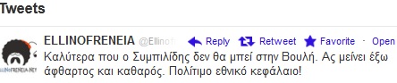 Με τον δικό της ξεχωριστό τρόπο σχολιάζει η Ελληνοφρένεια στο Twitter την αποχώρηση του Γιώργου Συμπιλίδη από τα ψηφοδέλτια της Νέας Δημοκρατίας. «Καλύτερα που ο Συμπιλίδης δεν θα μπει στην Βουλή. Ας μείνει έξω άφθαρτος και καθαρός. Πολύτιμο εθνικό κεφάλαιο!», είναι το σχόλιο της Ελληνοφρένειας.