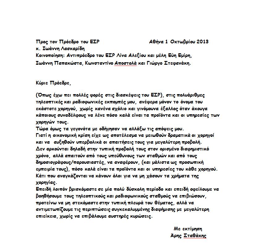 Με επιστολή του προς τον Πρόεδρο του ΕΣΡ από την 1η Οκτωβρίου 2013, ο δημοσιογράφος και μέλος του ΕΣΡ ‘Αρης Σταθάκης επισημαίνει ότι λόγω της κρίσης έχει μειωθεί δραματικά η διαφημιστική δαπάνη προς τους ραδιοφωνικούς και τηλεοπτικούς σταθμούς και υπεραμύνεται των αναφορών που γίνονται στους χορηγούς από τους παραγωγούς. Με την ίδια επιστολή του, ζητά από τον Ιωάννη Λασκαρίδη, οι περιπτώσεις τέτοιων αναφορών να αντιμετωπίζονται με επιείκεια και να μην επιβάλλονται κυρώσεις.
