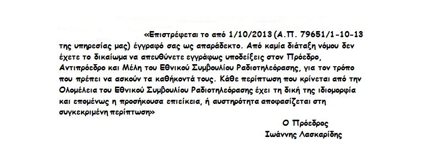 Ενδεικτική της… ευαισθησίας, για το συγκεκριμένο θέμα, είναι η απάντηση που έδωσε ο Πρόεδρος του ΕΣΡ Ιωάννης Λασκαρίδης στον ‘Αρη Σταθάκη. Διαβάστε παρακάτω την αντίδραση του κ.Λασκαρίδη ο οποίος επέστρεψε την επιστολή στον αποστολέα της…