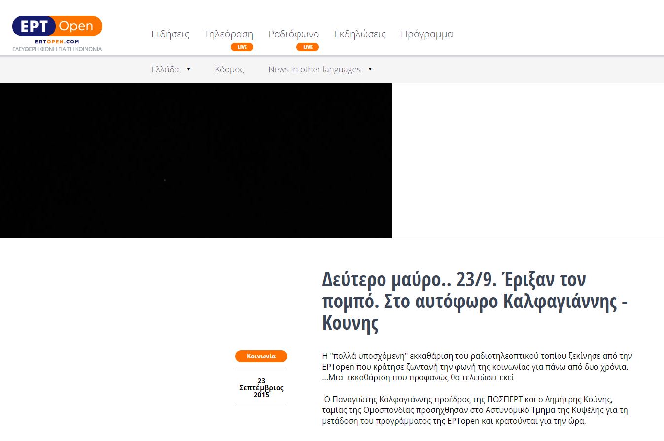 Ο Παναγιώτης Καλφαγιάννης προέδρος της ΠΟΣΠΕΡΤ και ο Δημήτρης Κούνης, ταμίας της Ομοσπονδίας προσήχθησαν στο Αστυνομικό Τμήμα της Κυψέλης για τη μετάδοση του προγράμματος της ΕΡΤopen και κρατούνται για την ώρα».