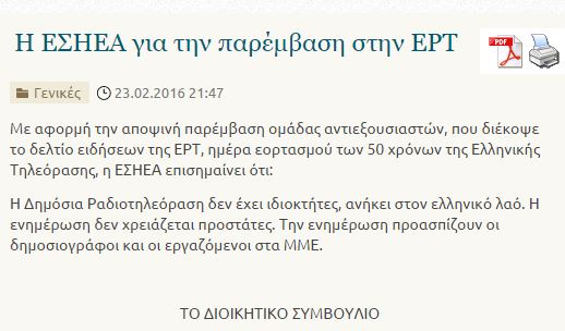 «Με αφορμή την αποψινή παρέμβαση ομάδας αντιεξουσιαστών, που διέκοψε το δελτίο ειδήσεων της ΕΡΤ, ημέρα εορτασμού των 50 χρόνων της Ελληνικής Τηλεόρασης, η ΕΣΗΕΑ επισημαίνει ότι: