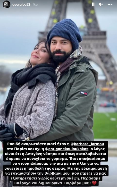 «Επειδή αναρωτιέστε γιατί ήταν η Βαρβάρα Λάρμου στο Παρίσι και όχι η Αντιγόνη Κουλουκάκου, ο λόγος είναι ότι η Αντιγόνη νόσησε και όπως καταλαβαίνετε έπρεπε να συνεχιστεί το γύρισμα. Έτσι αποφασίσουμε να ντουμπλάρουμε τη μία με την άλλη για να συνεχίσει η προβολή της σειράς. Με την ευκαιρία αυτή, να ευχαριστήσω την Βαρβάρα μου, που έτρεξε να μας εξυπηρετήσει χωρίς δεύτερη σκέψη. Περάσαμε υπέροχα και δημιουργικά. Βαρβάρα μου!», έγραψε ο Ανδρέας Γεωργίου.