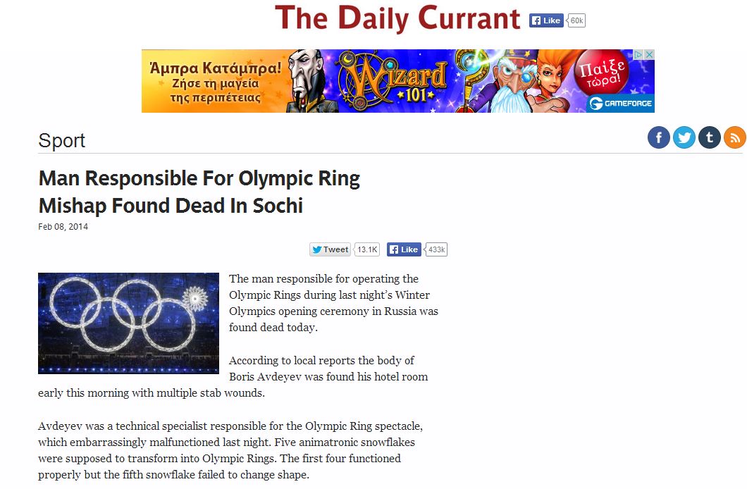 Τον γύρο του κόσμου σε πολλές ιστοσελίδες έκανε η είδηση ότι ο υπεύθυνος για το τεχνικό λάθος με τους Ολυμπιακούς κύκλους στο Σότσι, βρέθηκε νεκρός. Τη… ζημιά την ξεκίνησε η Daily Currant, μια Αμερικανική ιστοσελίδα, σατιρικού περιεχομένου.