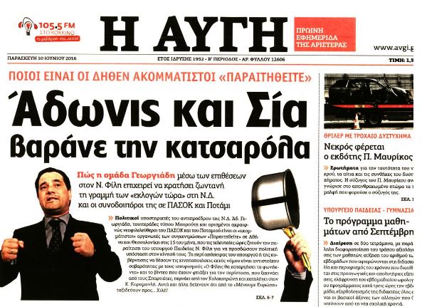 Κόντρα έχει ξεσπάσει ανάμεσα στην «Αυγή» και τον αντιπρόεδρο της ΝΔ Άδωνι Γεωργιάδη με αφορμή το σημερινό πρωτοσέλιδο της εφημερίδας σχετικά με τις κινητοποιήσεις των «Παραιτηθείτε» με τίτλο «Άδωνις και Σια βαράνε την κατσαρόλα». Το δημοσίευμα κάνει λόγο για «δήθεν ακομμάτιστους» διοργανωτές του κινήματος.