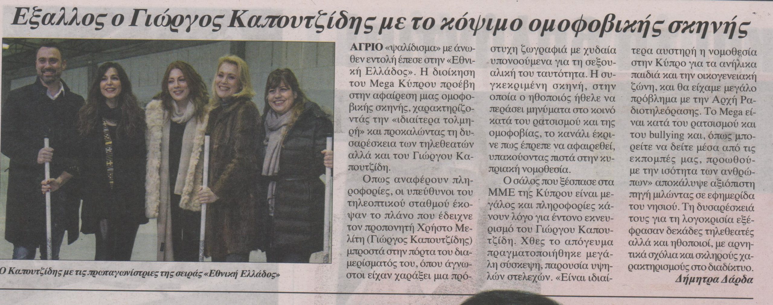 Η διοίκηση του Mega Κύπρου προέβη στην αφαίρεση μιας ομοφοβικής σκηνής στο σίριαλ του Γιώργου Καπουτζίδη “Εθνική Ελλάδος” χαρακτηρίζοντάς την “ιδιαίτερα τολμηρή” προκαλώντας τη δυσαρέσκεια των τηλεθεατών αλλά και του Γιώργου Καπουτζίδη.