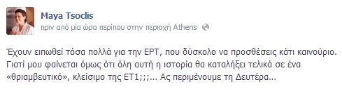 Η δημοσιογράφος που εργάστηκε για αρκετά χρόνια στην ΕΡΤ, μεταφέρει μέσω της προσωπικής της σελίδας στο facebook, τις προβλέψεις της για την κρατική ραδιοτηλεόραση.