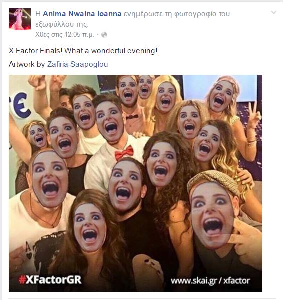 Έτσι ανήρτησε μία φωτογραφία στο προσωπικό της προφίλ στο facebook, στην οποία απεικονίζονται όλοι οι συμμετέχοντες να ποζάρουν στο green room και τα πρόσωπά τους έχουν αντικατασταθεί από την ίδια…
