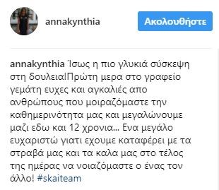 “Ίσως η πιο γλυκιά σύσκεψη στη δουλειά! Πρώτη μέρα στο γραφείο γεμάτη ευχές και αγκαλιές από ανθρώπους που μοιραζόμαστε την καθημερινότητα μας και μεγαλώνουμε μαζί εδώ και 12 χρόνια… Ένα μεγάλο ευχαριστώ γιατί έχουμε καταφέρει με τα στραβά μας και τα καλά μας στο τέλος της ημέρας να νοιαζόμαστε ο ένας τον άλλο” έγραψε χαρακτηριστικά.