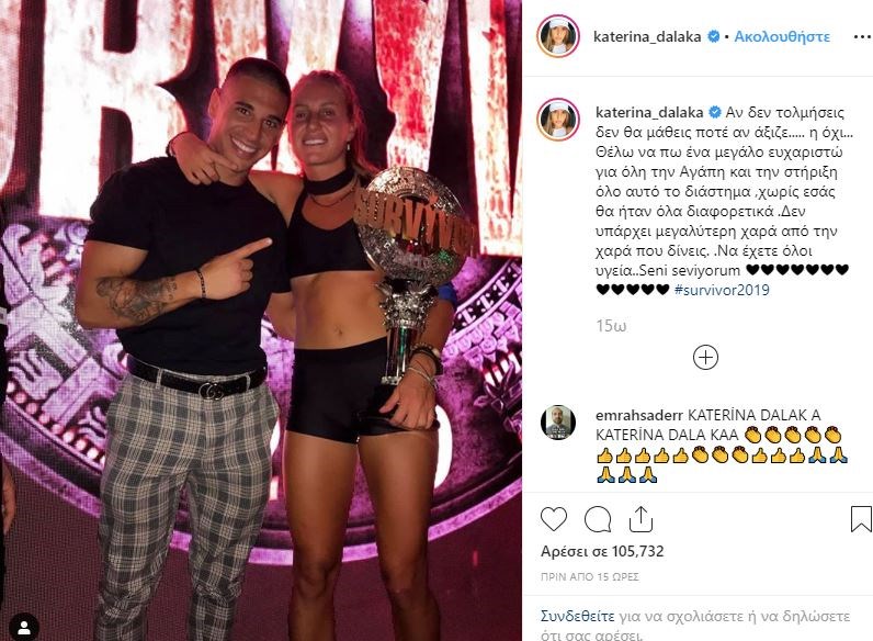 Τους ανθρώπους που τη στήριξαν κατά τη διάρκεια του Survivor, ευχαρίστησε η Κατερίνα Δαλάκα, στην πρώτη της ανάρτηση στο Instagram, μετά τη νίκη της στο παιχνίδι επιβίωσης.«Αν δεν τολμήσεις δεν θα μάθεις ποτέ αν άξιζε….. η όχι… Θέλω να πω ένα μεγάλο ευχαριστώ για όλη την αγάπη και την στήριξη όλο αυτό το διάστημα, χωρίς εσάς θα ήταν όλα διαφορετικά .Δεν υπάρχει μεγαλύτερη χαρά από την χαρά που δίνεις. .Να έχετε όλοι υγεία.. Seni seviyorum». Δείτε την ανάρτηση: