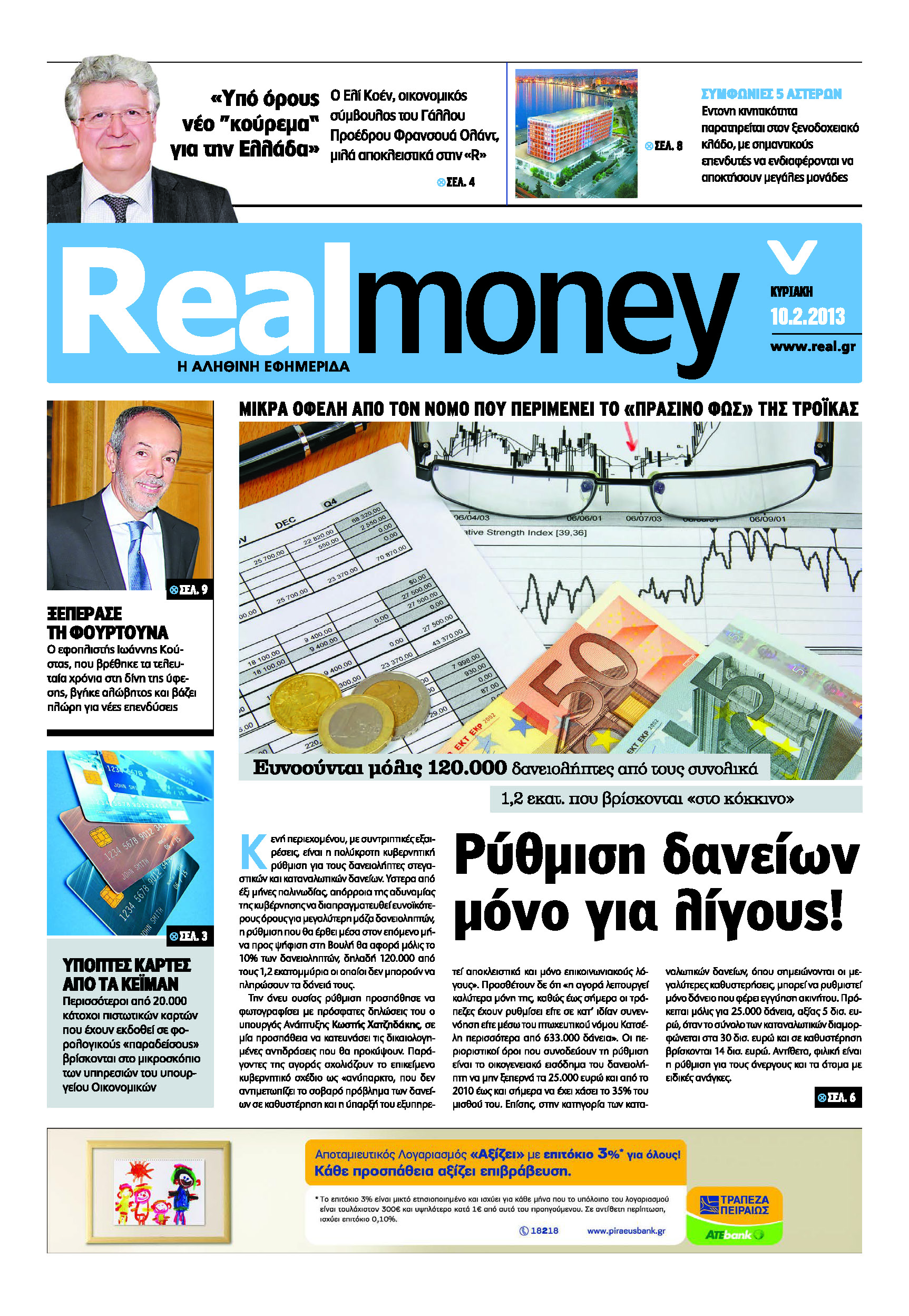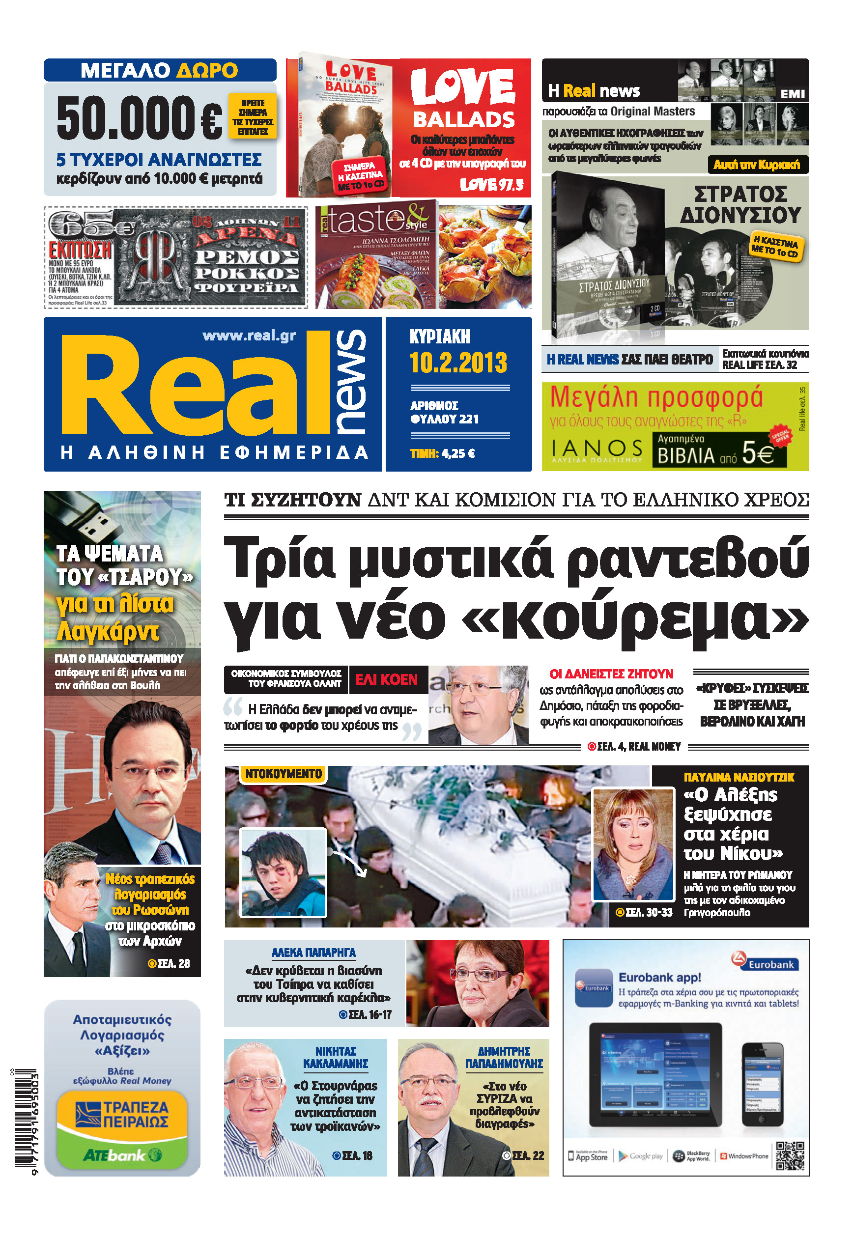 Με τίτλο: “Τρία μυστικά ραντεβού για νέο κούρεμα” κυκλοφορεί σήμερα η Realnews, η οποία αποκαλύπτει τις “κρυφές” συσκέψεις σε Βρυξέλλες, Βερολίνο και Χάγη, αλλά και όσα συζητούν ΔΝΤ και Κομισιόν για το ελληνικό χρέος. Σύμφωνα με το ρεπορτάζ της εφημερίδας “οι δανειστές ζητούν ως αντάλλαγμα απολύσεις στο Δημόσιο, πάταξη της φοροδιαφυγής και αποκρατικοποιήσεις”. Επίσης, ο οικονομικός σύμβουλος του Φρανσουά Ολάντ, Ελί Κοέν, σε συνέντευξή του λέει μεταξύ άλλων: “Η Ελλάδα δεν μπορεί να αντιμετωπίσει το φορτίο του χρέους της”.