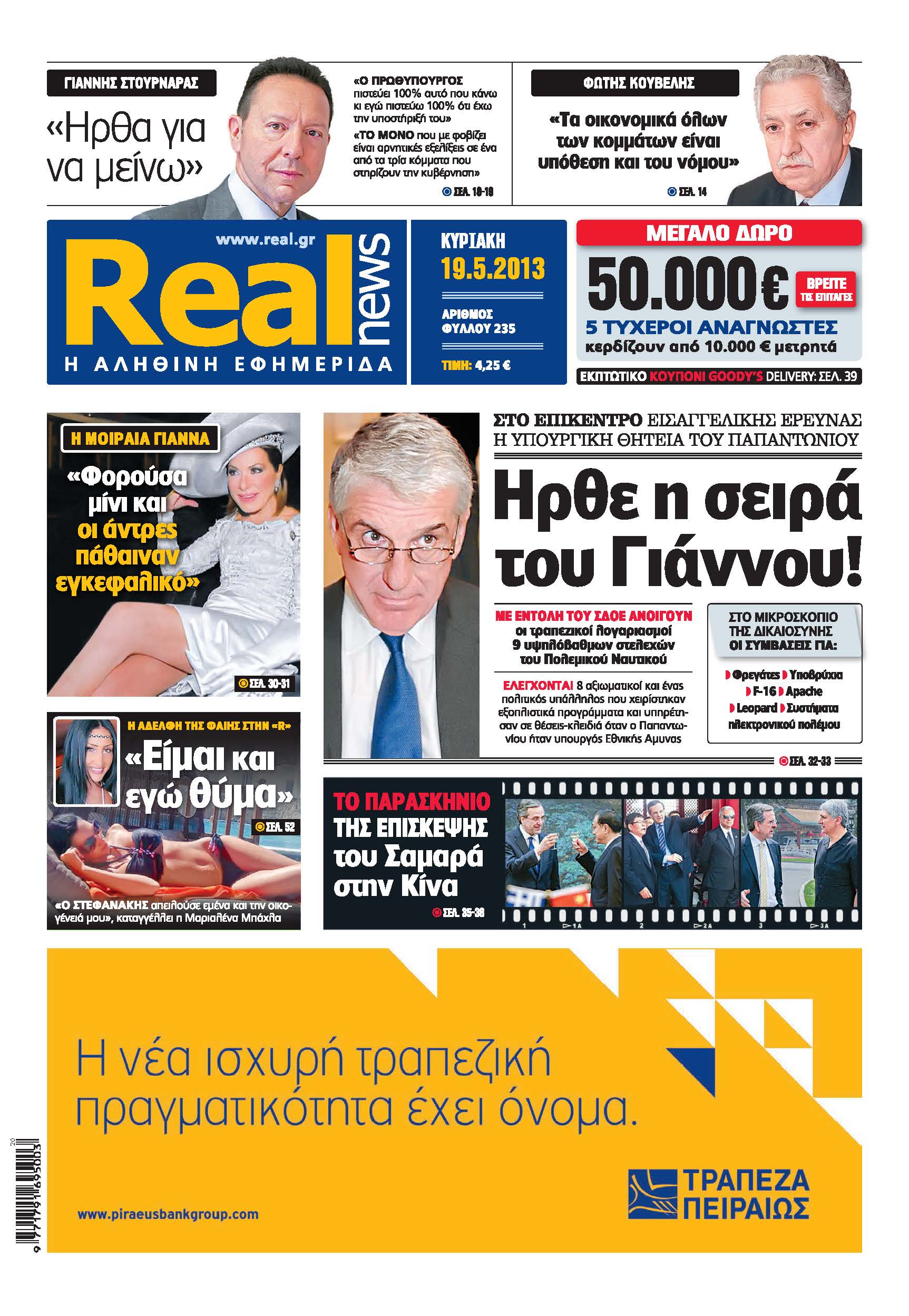 Με τίτλο: “Ηρθε η σειρά του Γιάννου!” κυκλοφορεί σήμερα η Realnews, η οποία αναφέρεται στην εισαγγελική έρευνα που έχει βάλει στο επίκεντρο την υπουργική θητεία του Γ. Παπαντωνίου. Σύμφωνα με το ρεπορτάζ της εφημερίδας “στο μικροσκόπιο της Δικαιοσύνης βρίσκονται οι συμβάσεις για φρεγάτες, υποβρύχια, F-16, Apache, Leopard, Συστήματα ηλεκτρονικού πολέμου”. Ηδη με εντολή του ΣΔΟΕ ανοίγουν οι τραπεζικοί λογαριασμοί 9 υψηλόβαθμων στελεχών του Πολεμικού Ναυτικού, καθώς ελέγχονται 8 αξιωματικοί και ένας πολιτικός υπάλληλος που χειρίστηκαν εξοπλιστικά προγράμματα και υπηρέτησαν σε θέσεις-κλειδιά όταν ο Γ. Παπαντωνίου ήταν υπουργός Εθνικής Αμυνας.