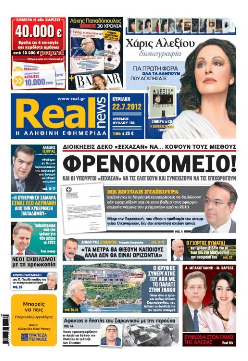 Με τίτλο «Φρενοκομείο!» κυκλοφορεί αυτήν την Κυριακή η Realnews, η οποία αποκαλύπτει ότι «διοικήσεις ΔΕΚΟ «ξέχασαν» να…κόψουν μισθούς και οι υπουργοί «ξέχασαν» να τις ελέγξουν και συνεχίζουν να τις επιχορηγούν». Σύμφωνα με τη Realnews, «με εντολή Σταϊκούρα καλούνται οι δημόσιες επιχειρήσεις να δηλώσουν εάν εφαρμόζουν και σε ποιό βαθμό τους εφαρμοστικούς νόμους του μνημονίου από το 2010». Η προθεσμία έληγε την Παρασκευή και μέχρι τότε δεν είχε απαντήσει σχεδόν κανείς!